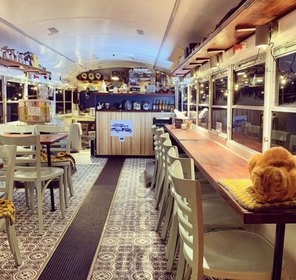 The Skool Beans Café is incongruously housed in a retrofitted yellow American school bus. Proprietor Holly Keyser was looking for a truck to convert for her coffeeshop on wheels when she stumbled on the big yellow bus and it was kismet. After two years of hard work and sweat equity, Keyser flipped the script on the now iconic food truck model and created a version that brings the customer inside.