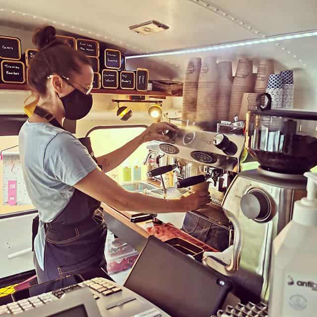 The Skool Beans Café is incongruously housed in a retrofitted yellow American school bus. Proprietor Holly Keyser was looking for a truck to convert for her coffeeshop on wheels when she stumbled on the big yellow bus and it was kismet. After two years of hard work and sweat equity, Keyser flipped the script on the now iconic food truck model and created a version that brings the customer inside.