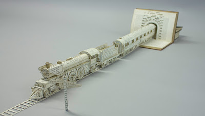 This Murder on the Orient Express book sculpture was created by Thomas Wightman as promotional material for the Agatha Christie remake of the film by 20th Century Fox. The film was one of the many adaptations of the now classic Agatha Christie mystery.