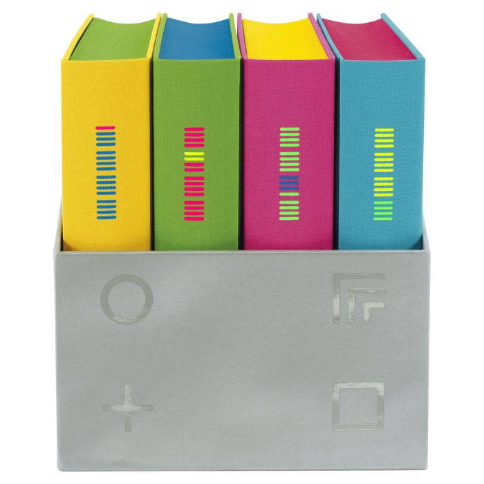 This limited edition of Philip K. Dick’s The Complete Short Stories, with 24 illustrations by 24 different artists, is a celebration of the freewheeling imagination of a science-fiction master. The Complete Short Stories is limited to 750 hand-numbered copies and presented in a special display box designed by independent studio La Boca. The bindings, endpapers, title pages, page edges – even the ribbon markers – are colour co-ordinated in a fabulous fluorescent rainbow. Each binding is emblazoned with an eye-catching symbol that is echoed on the relevant title page and spot-varnished on the two-part presentation box. The interior of the box itself is lined with two specially designed papers; a multi-coloured ‘glitch’ pattern, and a night sky sparkling with silver stars to reflect Dick’s fascination with the possibilities of space travel and technology.