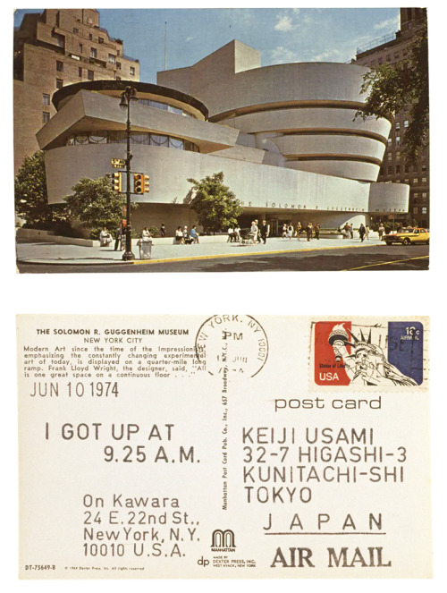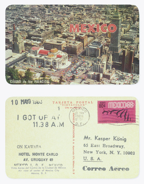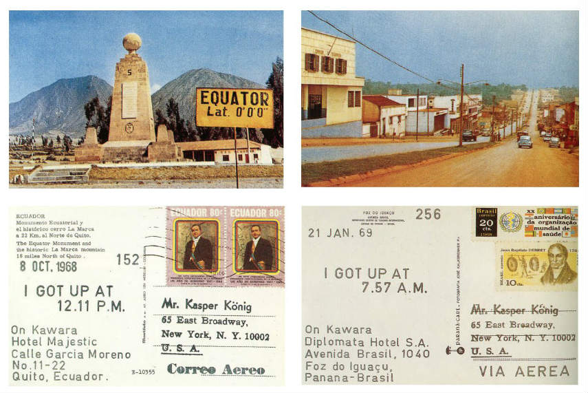 On Kawara was a 20th century Japanese conceptual artist who was influential in the New York art scene. Although he was widely know for his “Today” series or “Date Paintings,” many considered that the most personal and intimate of his works was “I GOT UP AT.” The series is part of a continuous piece produced by the artist between 1968 and 1979 in which each day he sent 2 different friends or colleagues a picture postcard, each stamped with the exact time he arose that day and the addresses of both sender and recipient. The length of each correspondence ranged from a single card to hundreds sent consecutively over a period of months.