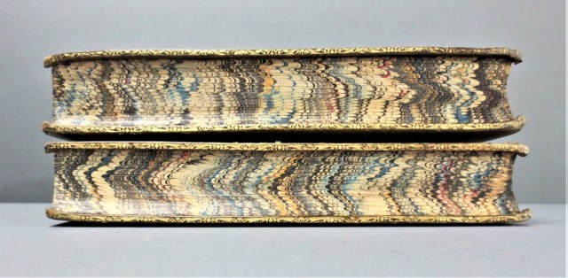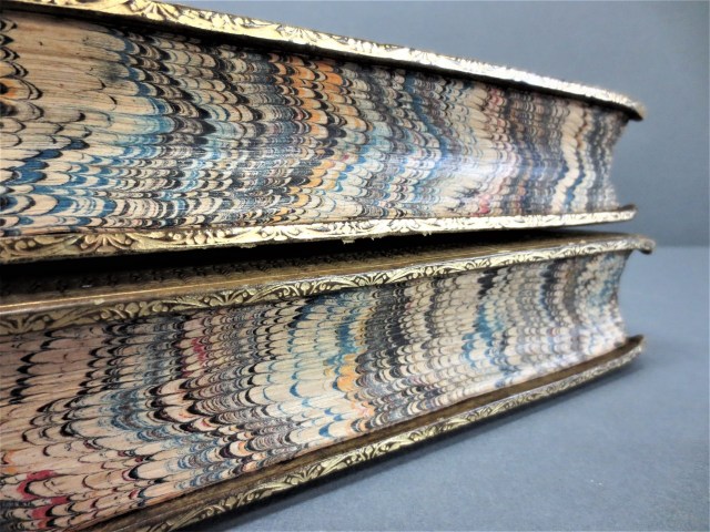 This example for Fore Edge Friday comes from the second edition of The Canterbury Tales of Chaucer to Which are Added an Essay on His Language and Versification, and an Introductory Discourse, Together with Notes and a Glossary by English classical scholar Thomas Tyrwhitt, published for Oxford University by the Clarendon Press in 1798. The edges on all three sides and on the endpapers have been marbled in what is called a Double Comb or Double Nonpareil pattern.