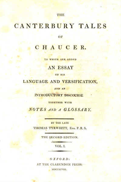 Thomas Tyrwhitt‘s first edition of The Canterbury Tales appeared in a 4-volume set in 1775, with a 5-volume glossary published in 1778, both published in London by Thomas Payne and Son. This second edition was published posthumously, as Tyrwhitt died in 1786. Tyrwhitt’s edition is particularly noted for establishing an authoritative text without editorial emendation based on the most reliable source material. It was considered a landmark in Chaucer editorial practice, but falls short by today’s standards only in that his text brings together a smattering of different dialects from different dates and localities rather than the dialect of Chaucer in fourteenth century London.