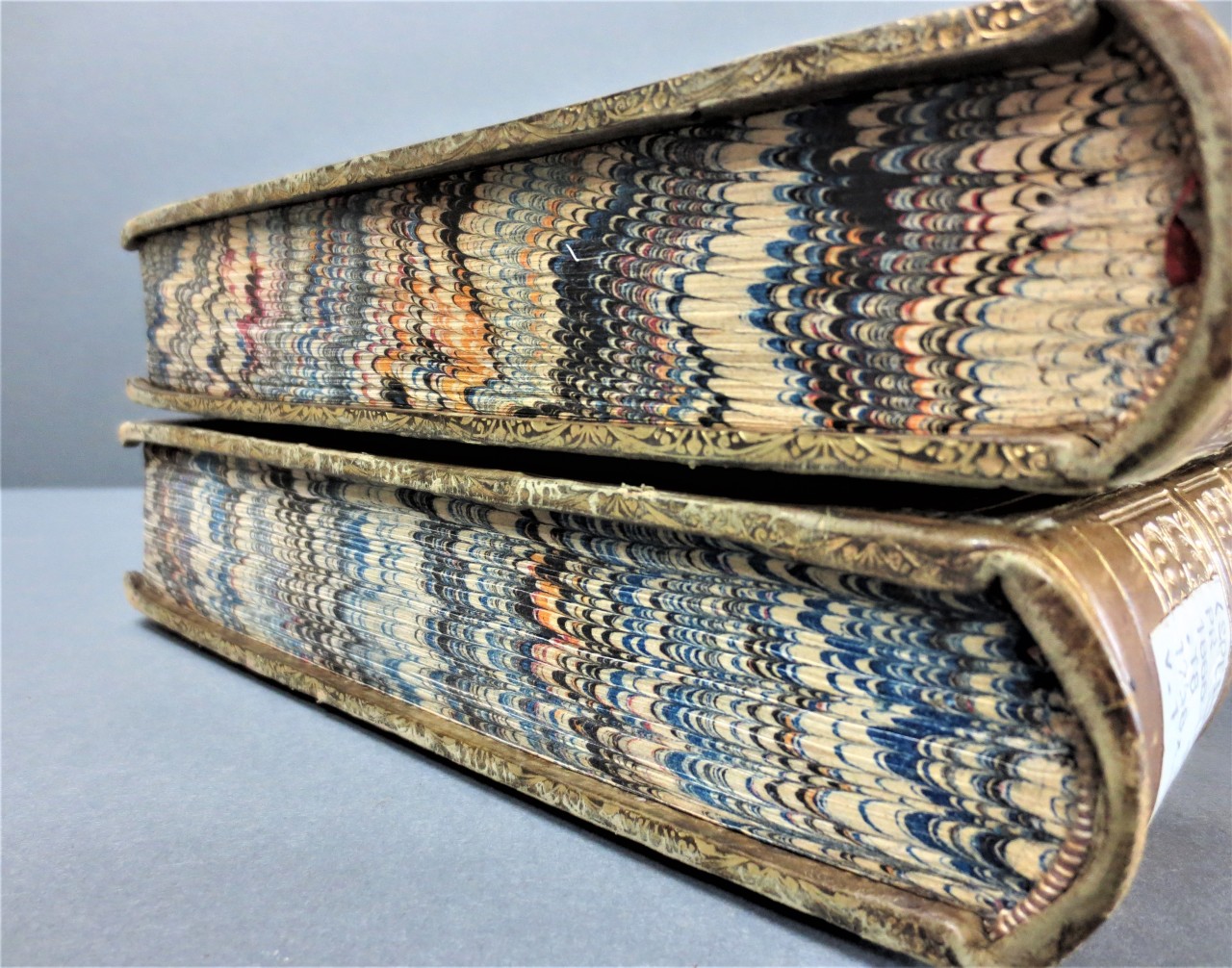 This example for Fore Edge Friday comes from the second edition of The Canterbury Tales of Chaucer to Which are Added an Essay on His Language and Versification, and an Introductory Discourse, Together with Notes and a Glossary by English classical scholar Thomas Tyrwhitt, published for Oxford University by the Clarendon Press in 1798. The edges on all three sides and on the endpapers have been marbled in what is called a Double Comb or Double Nonpareil pattern.