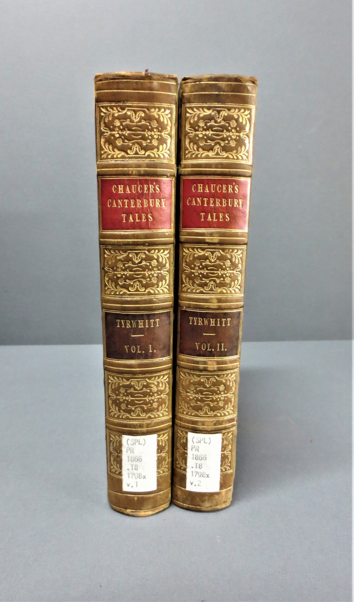 Thomas Tyrwhitt‘s first edition of The Canterbury Tales appeared in a 4-volume set in 1775, with a 5-volume glossary published in 1778, both published in London by Thomas Payne and Son. This second edition was published posthumously, as Tyrwhitt died in 1786. Tyrwhitt’s edition is particularly noted for establishing an authoritative text without editorial emendation based on the most reliable source material. It was considered a landmark in Chaucer editorial practice, but falls short by today’s standards only in that his text brings together a smattering of different dialects from different dates and localities rather than the dialect of Chaucer in fourteenth century London.