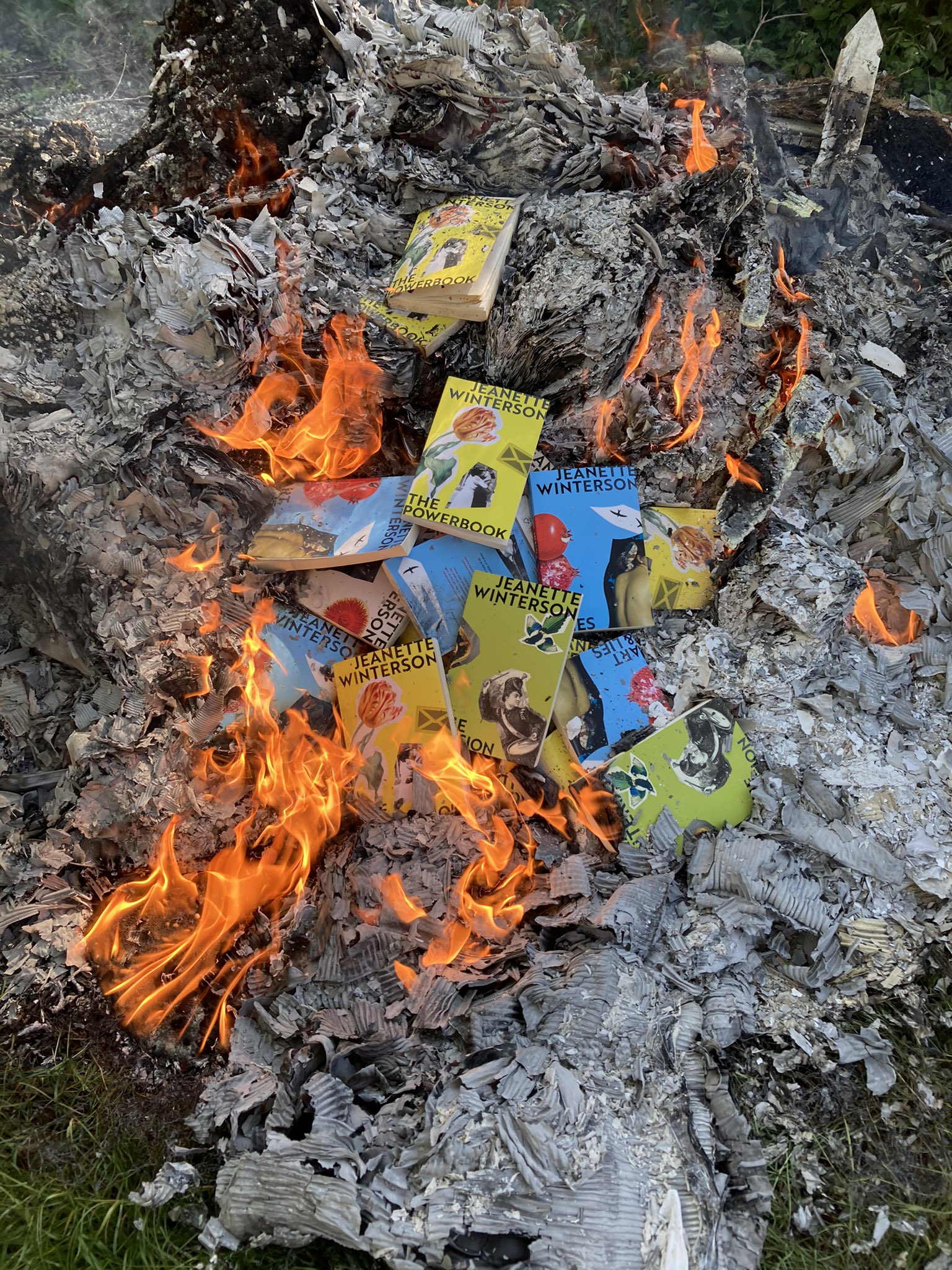 I recently read a story about a novel type of book burning. It seems that British author Jeanette Winterson was extremely disappointed in new editions of her novels that were published with cover art and blurbs that she found highly offensive. To emphasize her distaste, Winterson torched a pile of the books and posted a photo on Twitter with this tweet:
