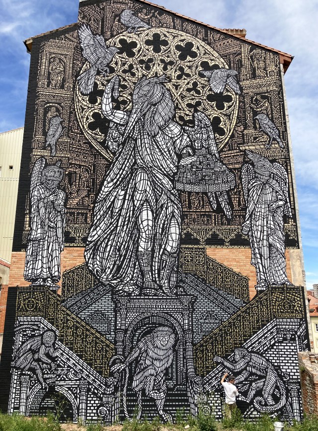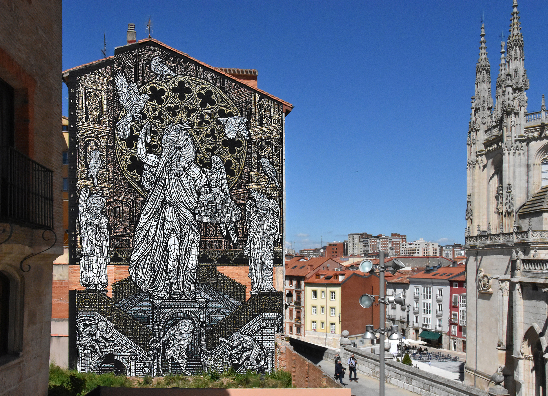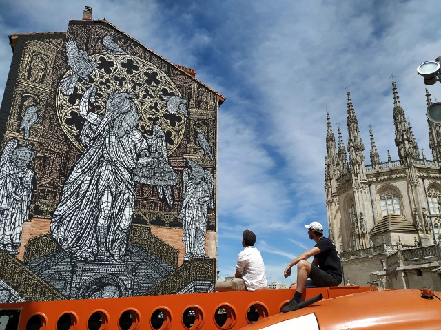 I love it when historical and modern art forms come together, so of course this amazing project caught my attention. To celebrate the 800th anniversary of the groundbreaking for the Santa Iglesia Catedral Basílica Metropolitana de Santa María de Burgos in Spain the community commissioned the French street artists Louis Boidron and Edouard Egea —aka Monkey Bird —to create a massive mural for the Cathedral.