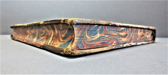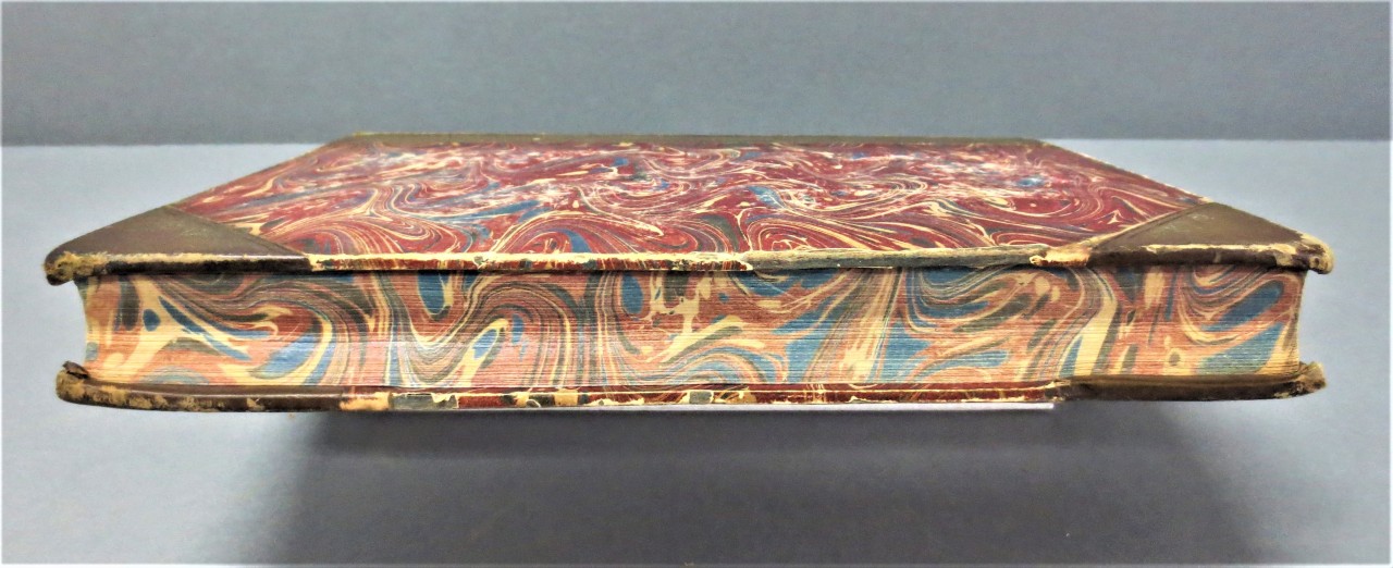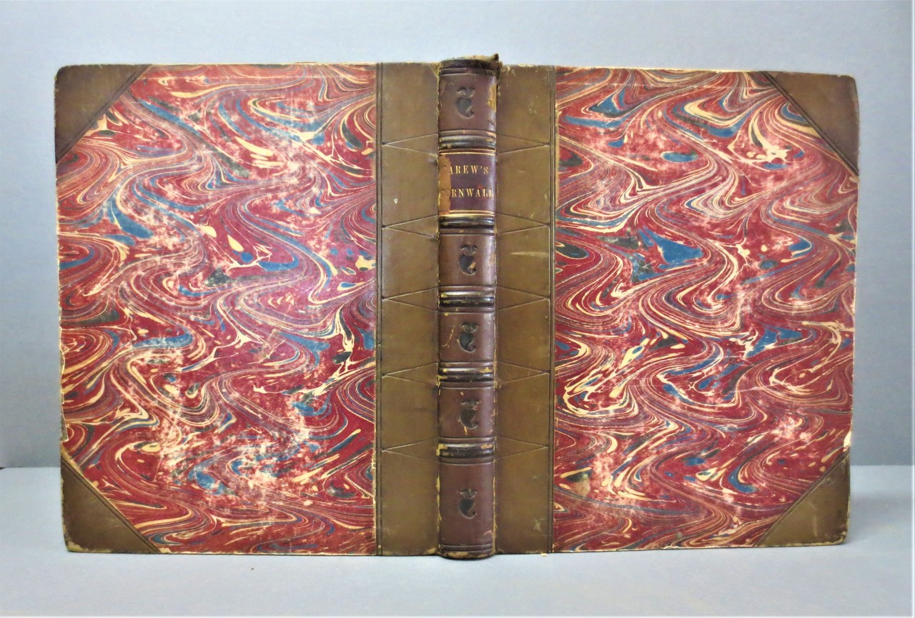 The wavy patterns on the edges, covers, and endpapers on this tooled and blind-stamped, half-bound book are from Carew’s Survey of Cornwall . This edition was printed in London by Thomas Bensley for J. Faulder and Rees and Curtis in 1811, although Carew’s book was originally published in 1602. The marbled-paper pattern on this volume is what the University of Washington’s site on Patterned Papers identifies as Serpentine.