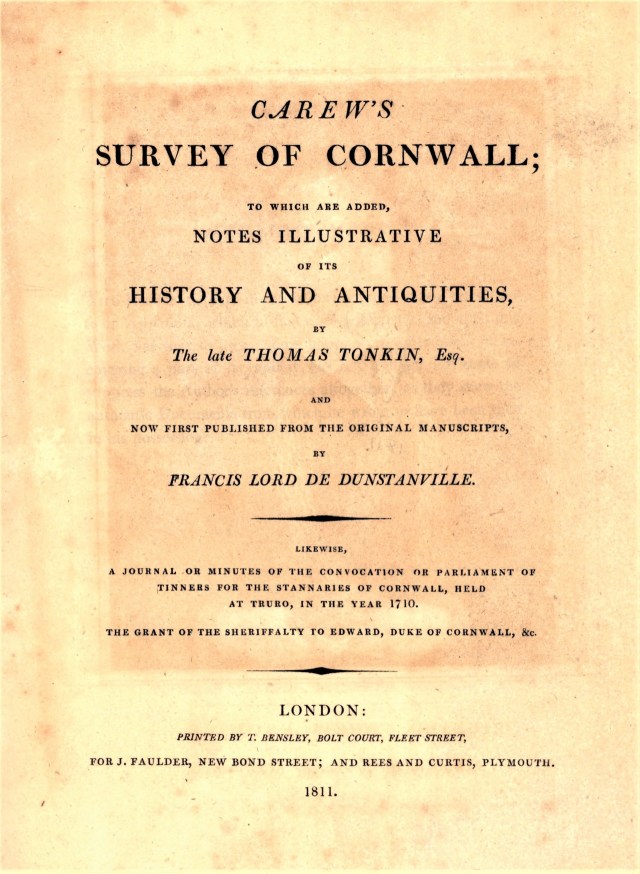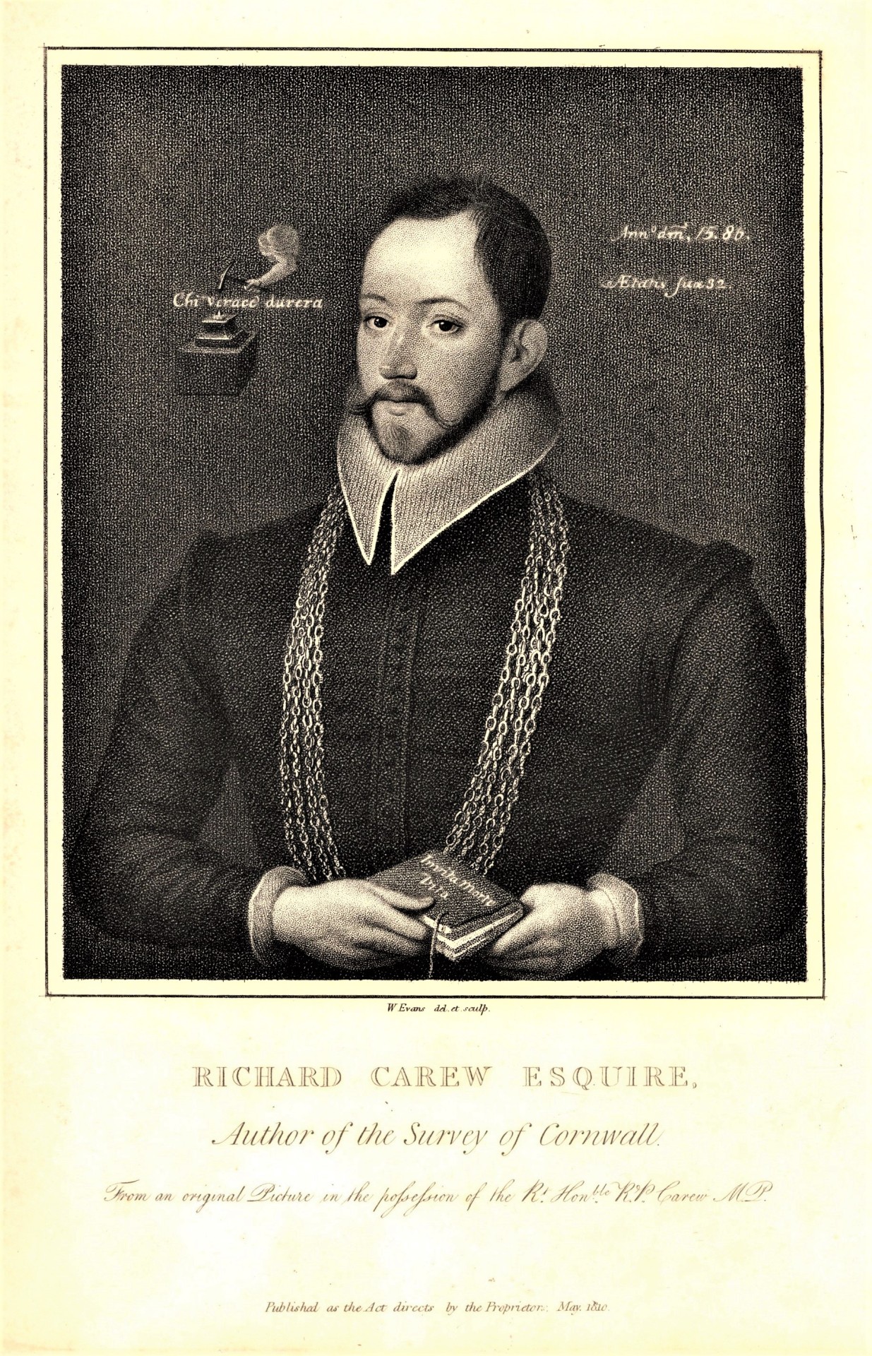 The frontispiece is a portrait of Richard Carew from 1586, rendered here as a stipple engraving by English engraver William Evans. Carew is shown holding a book with the Latin inscription Invita Morte Vita (In spite of life and death), and in the background there is an allegorical hammer and anvil with the Italian inscription Chi’verace durerà (Who is true will last).