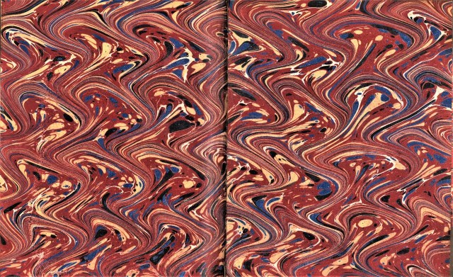 The pattern begins with a Turkish base. “A comb with one set of teeth is drawn through the bath twice vertically, once in either direction with the second pass halving the first. This step is repeated horizontally. Then the final step is to draw a comb, with one set of teeth set at slightly wider intervals, through the bath once vertically in wavy lines reminiscent of the way in which a snake moves.“ As we’ve noted before, when marbling the edges of a book, the text block is clamped tightly shut, and once dipped, the excess fluid is blown or shaken off quickly to prevent it from running into the book. Once dry, the marbled edges are burnished.