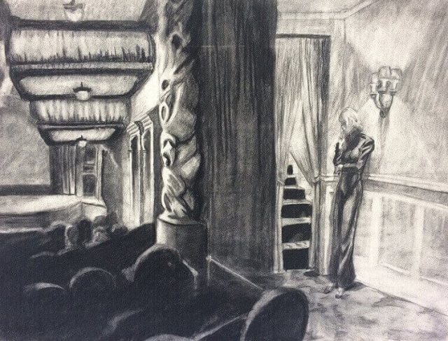 Study for Hopper’s 1939 painting. The woman posing under the light fixture was Hopper’s wife Jo.