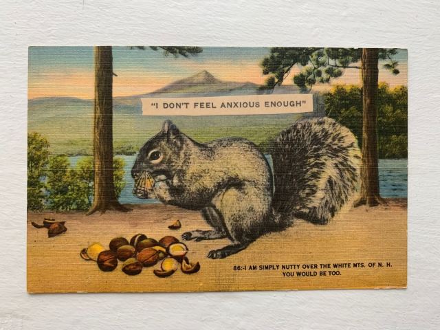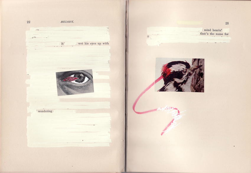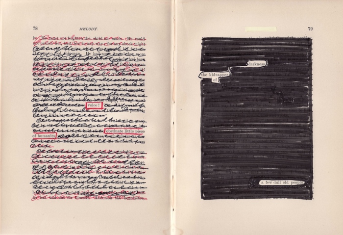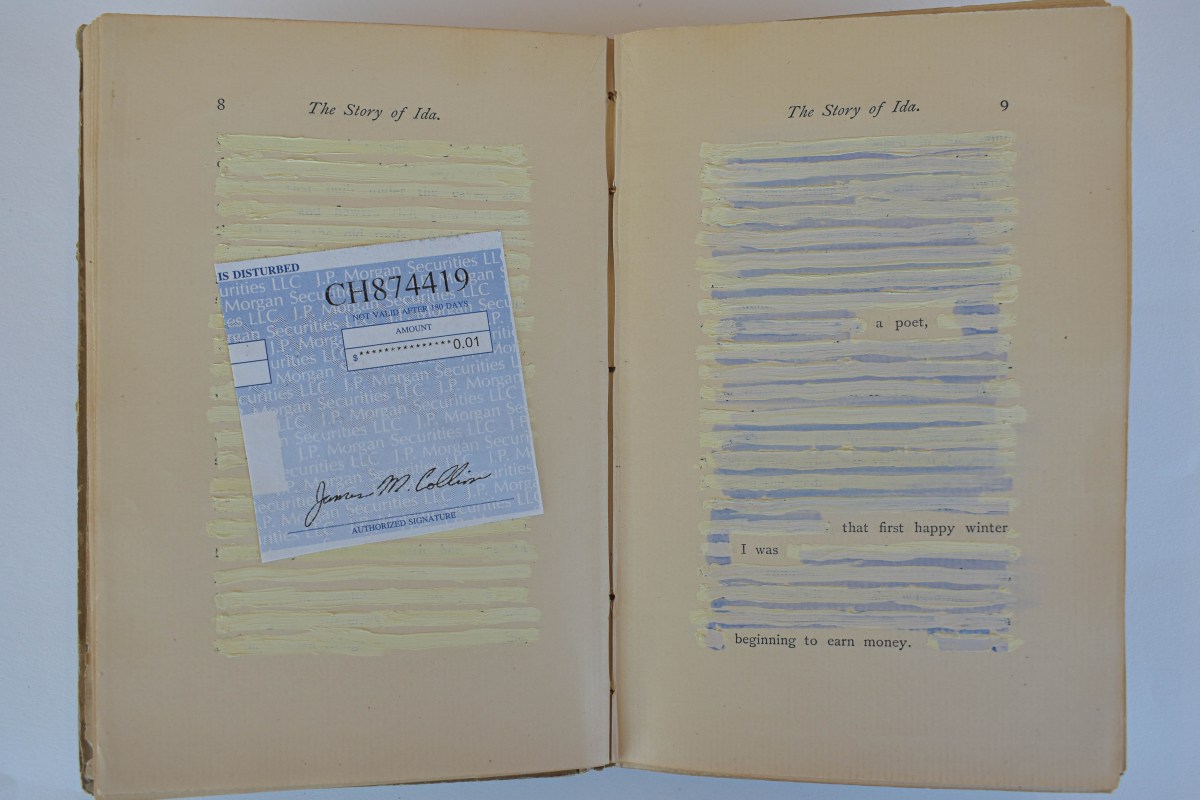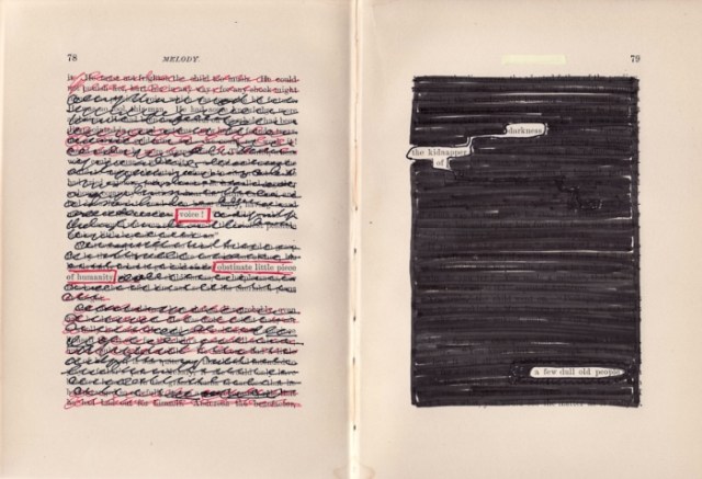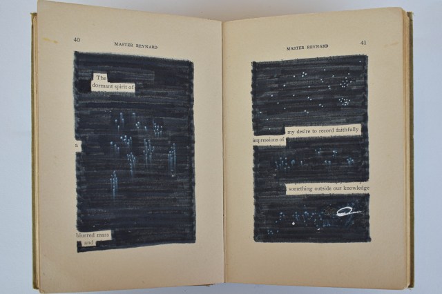 I am always somewhat ambivilant when it comes to book art that actually damages or destroys books, however, I am a fan of Vermont-based poet and book artist Mary Ruefle’s decades-long project Erasures. Since 1998, she has amended more than 100 books using markers, correctional fluid, paint, tape, and even cuts text cut-outs. Ruefle also adds photos, text, and drawings from other publications, as well as fiber art, pressed flowers, handwritten notes, grocery lists, and other found objects. Currently, a selection of her erased books, along with a set of her humorous, captioned postcards, is on display in Mary Ruefle: Erasures at the Robert Frost Stone House Museum in Bennington, Vermont.