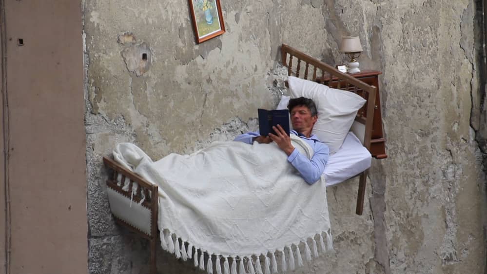 I’m not sure why videos and photos of French performance artist Thierry Mandon reading in bed have popped up this week since the event was in 2015. Still, it’s too good not to share. In his project “Inside-Outside”, the fully pajamaed performance artist comfortably reads in bed underneath a picture frame and in front of a nightstand, each of which is mounted onto an exterior stucco wall. This whole scene requires sustaining the illusion of relaxation while simultaneously maintaining perfect balance. This installation took place in Chambéry, France. Check out the marvelous short video below of the performance.