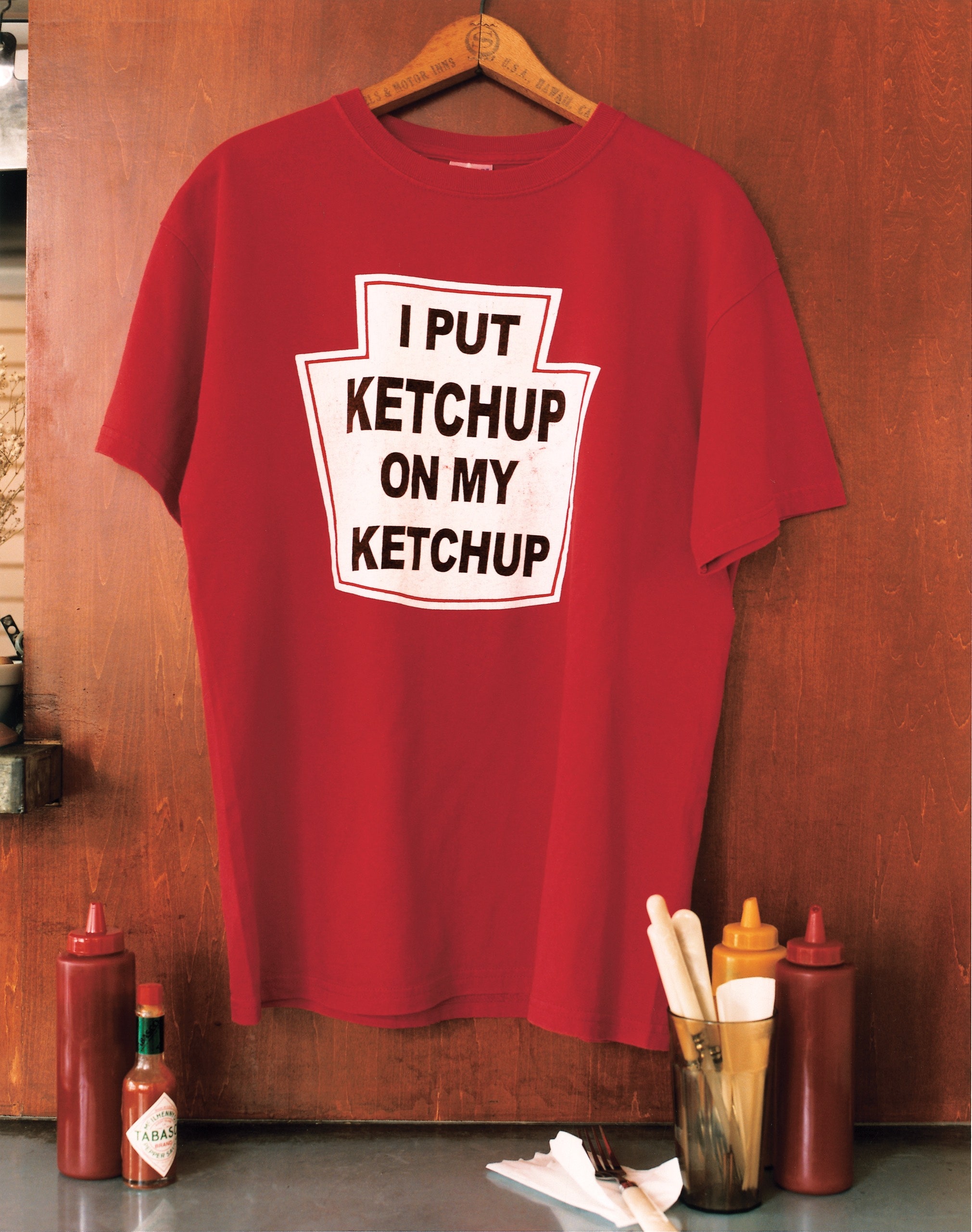 This T-shirt has a straightforward message: “I PUT KETCHUP ON MY KETCHUP.” Now, that’s the statement of somebody who is seriously in love with ketchup. It kind of teases those Americans who put ketchup on everything, but I find it interesting that one of the companies that distribute these shirts is none other than Heinz. A little self-deprecatory humor going on here, but you can’t help feeling the American spirit in it, the optimistic, cheerful lack of introspection that says, “Who cares about being sophisticated! I’m gonna do what I want!”