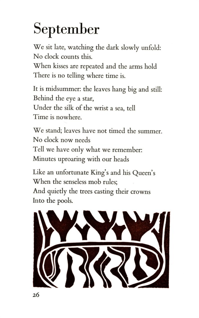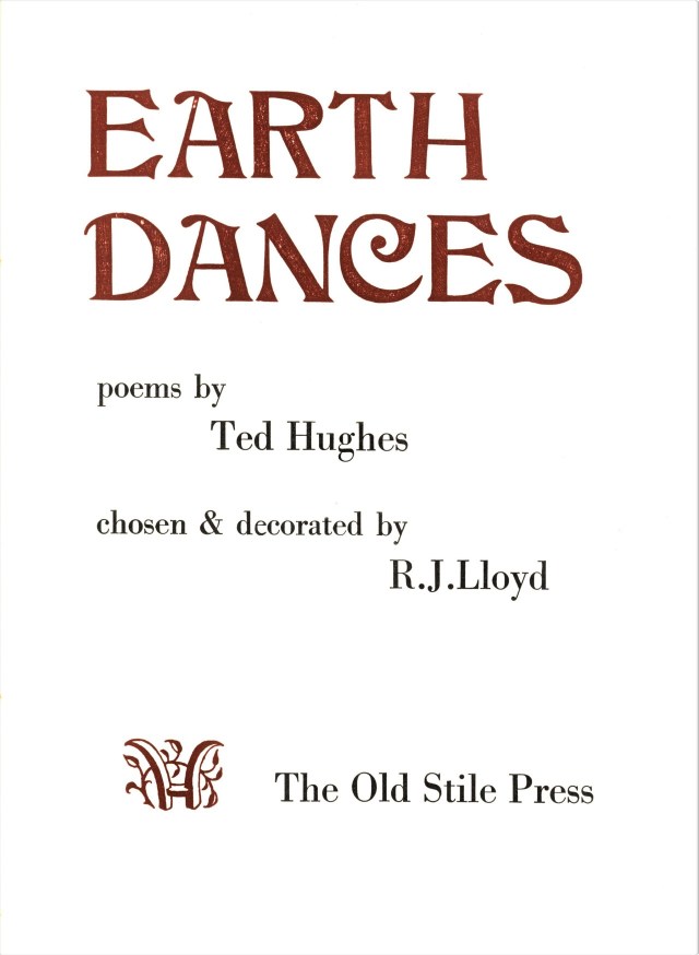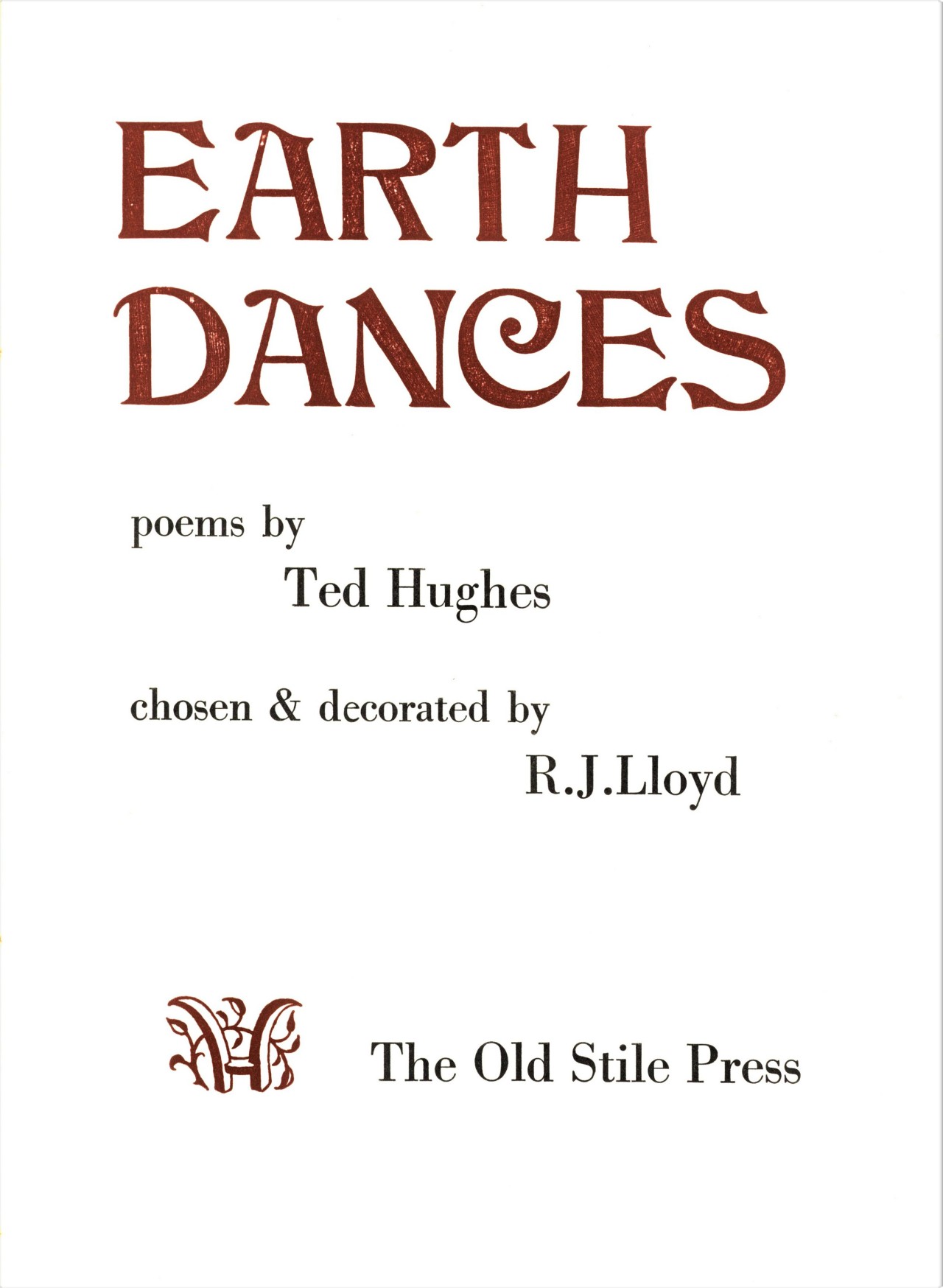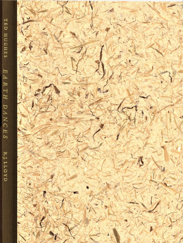This piece is from former British Poet Laureate Ted Hughes’s collection of poems Earth Dances, with original linocuts by British artist R. J. Lloyd and printed in 1994 in an edition of 250 copies signed by the poet and artist in 18 point Bembo and Bodoni on Rivoli paper by Nicolas McDowall at The Old Stile Press in Llandogo, Monmouthshire, Wales. The main images were printed on papers handmade by Frances McDowall which incorporate iris, nettle, onion, Japanese knotweed, pampas grass, and alkanet fibers. The binding was designed at The Old Stile Press and executed at The Fine Bindery in Wellingborough, England.