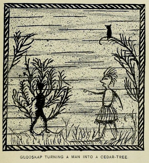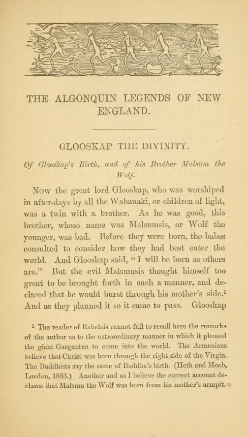 The Algonquin legends of New England : or, Myths and folk lore of the Micmac, Passamaquoddy, and Penobscot tribes, by Charels G. Leland; 1884; Sampson Low, Marston, Searle & Rivington in London. Is a brilliant collection of stories from the folklore tradition of the Algonquin (Algonquian, Algonkin) peoples of North America, in particular, as the subtitle tells us, of the “Micmac, Passamaquoddy, and Penobscot tribes”. The collection presented in the book is a result of the collecting efforts of folklorist Charles G. Leland and from Rev. Silas T. Rand, a Canadian Baptist clergyman who was the first to record the legend of Glooskap. It is this legend, with its many chapters, which takes up the majority of the book. The central character is a giant of a divinity named Glooskap, who “grows to a more appalling greatness than Thor or Odin in his battles”, and whose name literally means Liar, because it is said that when he left earth he promised to return but has never done so. In addition to Glooskap, a large proportion of the book is dedicated to “The Merry Tales of Lox, the Mischief-Maker”, a character, as Leland explains in his introduction, who ranges “from Punch to Satan, passing through the stages of an Indian Mephistopheles and the Norse Loki, who appears to have been his true progenitor”. Also, Throughout the book are scattered a set of wonderful illustrations, presumably copied from tribe members themselves, though no information is given on this.