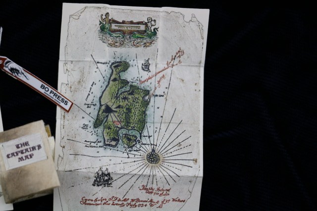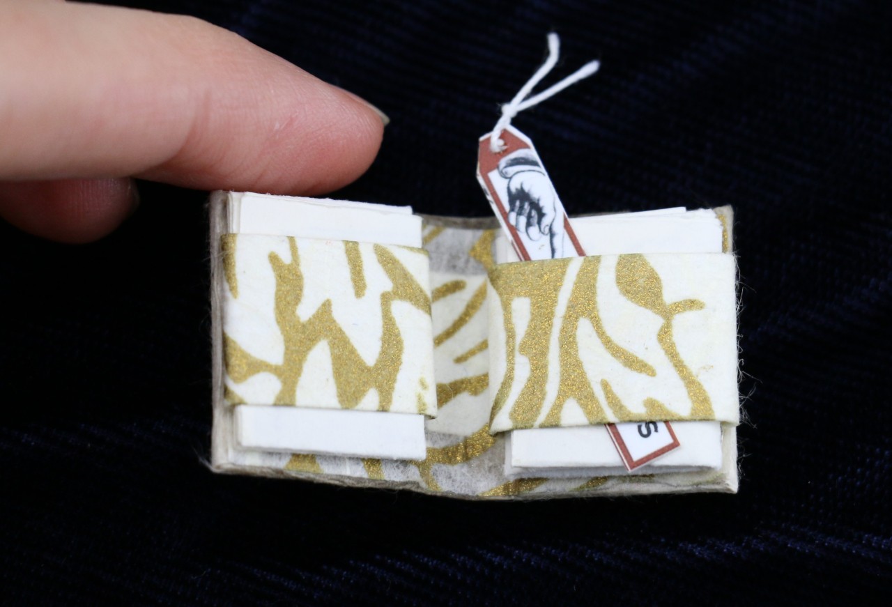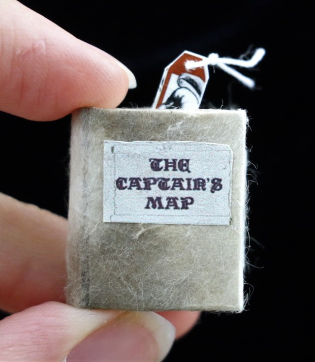 The Captain’s Map is a micro-miniature book containing a sheet of text from Robert Louis Stevenson’s Treasure Island and color map, each 78 x 30 mm, folded to 20 x 16 mm, along with a Bo Press bookmark, slipped in. The portfolio is bound in beige Japanese paper, and lined with paper printed with old map. It contains a tinted copy of the map on the recto. Published by Bo Press, the tiny Treasure Island is the work of miniaturist genius Pat Sweet. You can learn more about the book and see more of her work on her website: https://www.bopressminiaturebooks.com/
