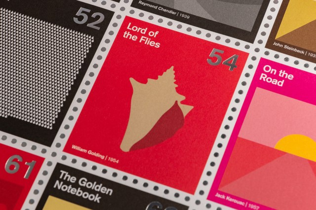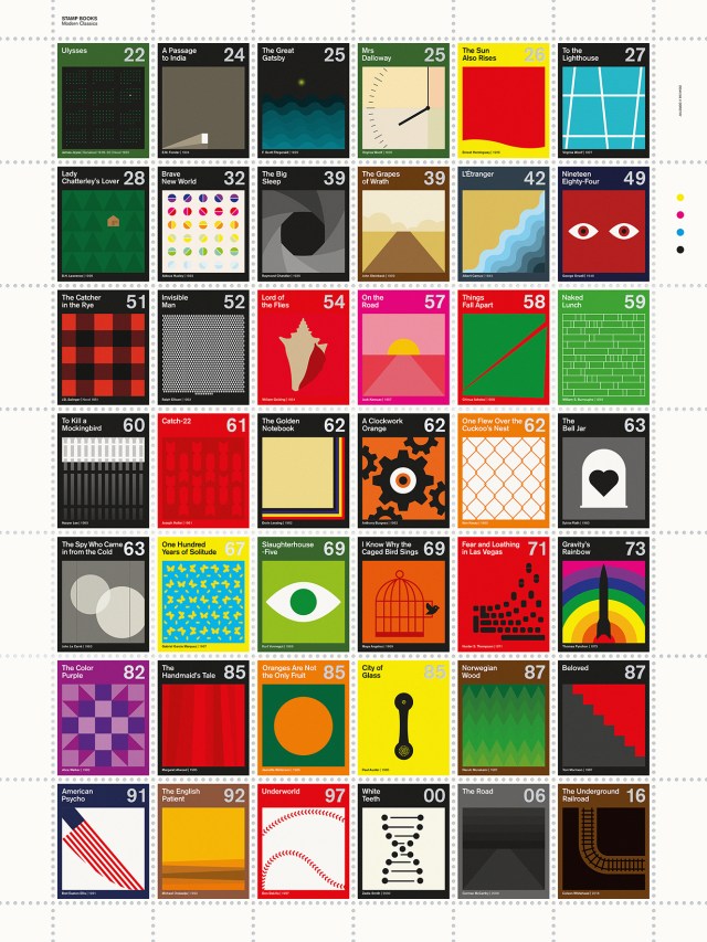 The Liverpool-based design studio Dorothy has created a wonderful series of colorful stamps based on 20th century literary works. Their Modern Classics collection, above, reimagines the covers of the 42 titles in clever and imaginative ways.