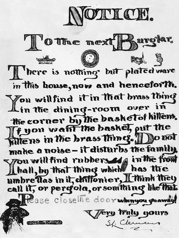 I always enjoy a good Mark Twain anecdote and this one tickled my fancy. In 1908 burglars surreptiously entered his Hartford mansion and stole a set of silverware from the sideboard. In response, he posted this notice on the front door: