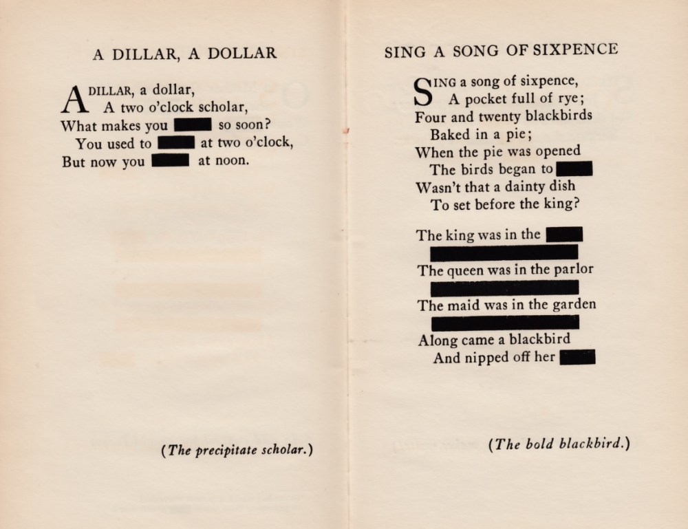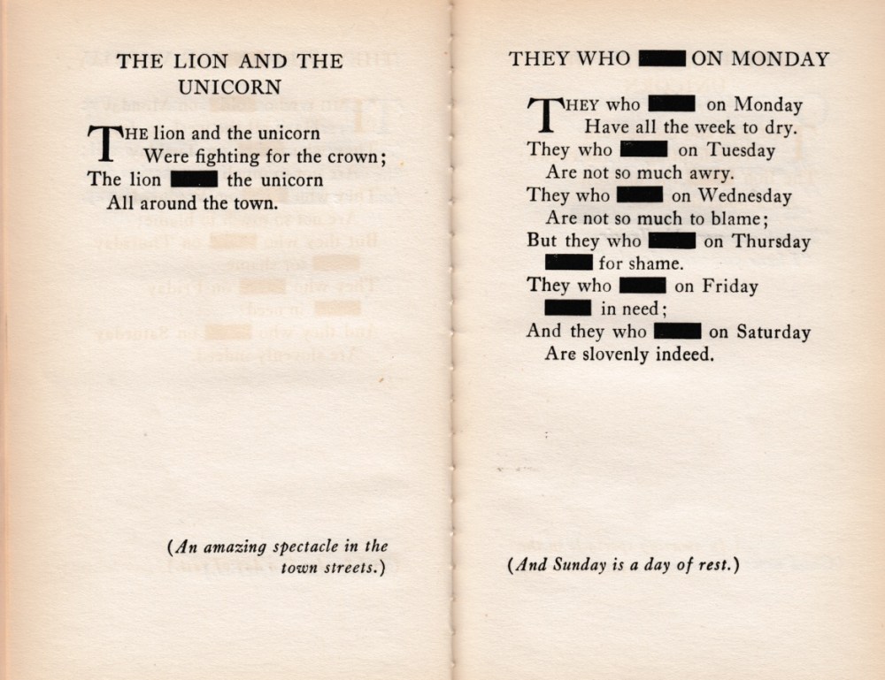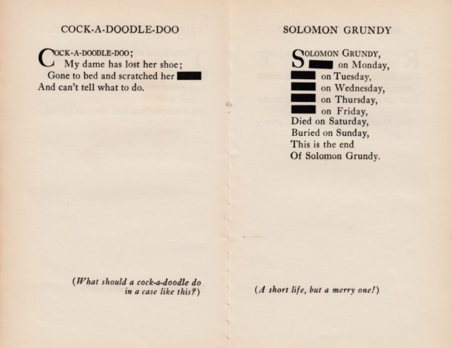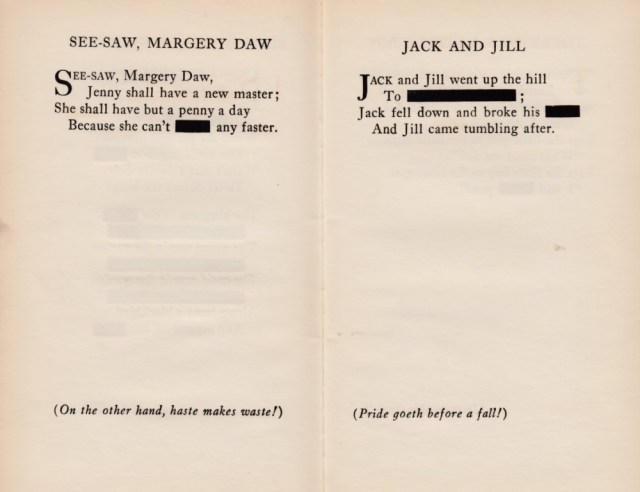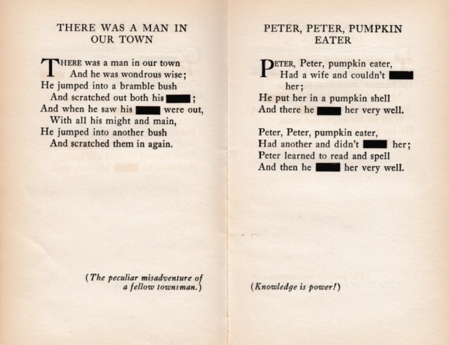 In 1926, author and poet Kendall Banning (real name) dedicated a self-published book of Censored Mother Goose Rhymes to “The Censors [of America] who have taught us how to read naughty meanings into harmless words.