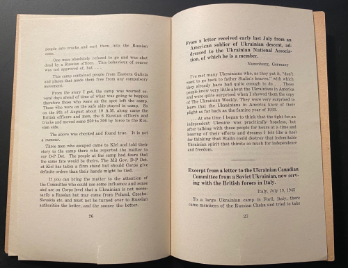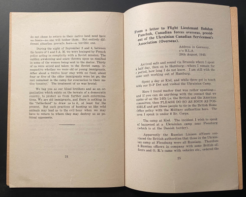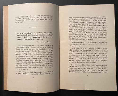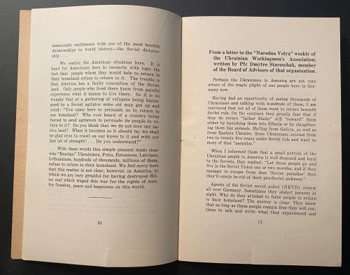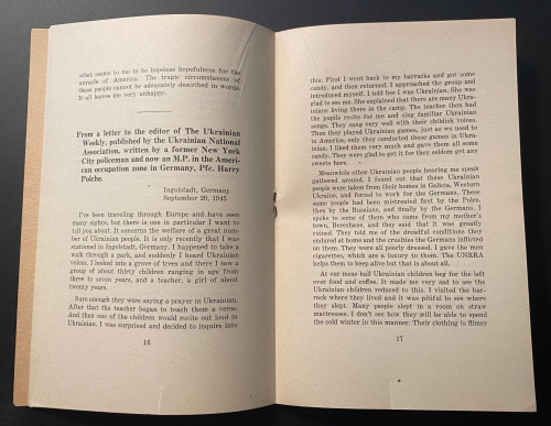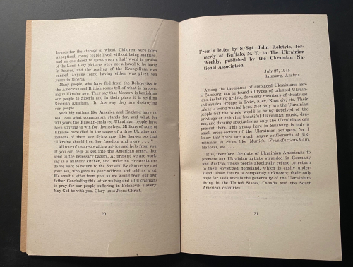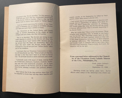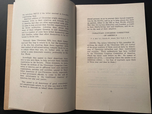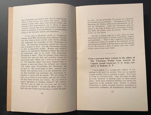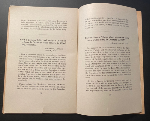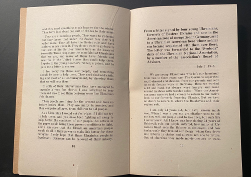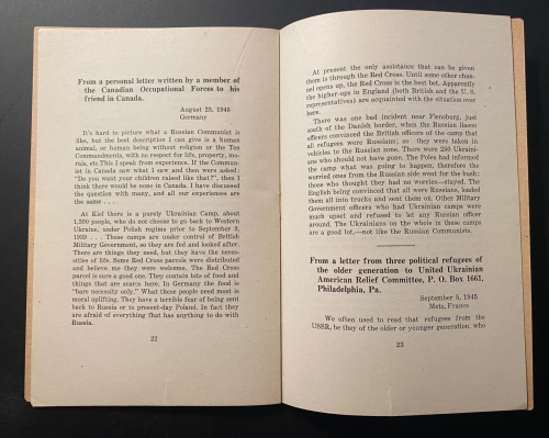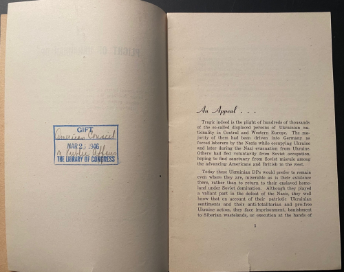 The pamphlet Plight of Ukrainian DPs : a few typical letters of many being received daily from Europe describing the tragic plight of Ukrainian displaced persons whom the Soviets would forcibly repatriate and doom to enslavement, persecution or death, was published in 1945. In just 31 pages, it describes the plight of Ukrainian displaced persons at the end of WWII. These millions of Ukrainians  had been war refugees or slave laborers forcibly moved by the Germans in their invasion of the Soviet Union and sent to work in German factories and on farms. Although some of the Ukrainians technically volunteered and were supposed to be paid for their labor, most were treated as virtual slaves. They were known as Ostarbeiter (Eastern Laborer), and at the end of the war many were repatriated to their country of origin. Of the 3.5 million Ostarbeiter, about 2.5 million remained alive at war’s end, with the vast majority–over 2 million–being from the Ukraine. This pamphlet details some of the terrible accounts of Ukrainians being repatriated to the Soviet Union and being treated as collaborators, criminals, and worse, some simply executed, while hundreds of thousands of others were sent on for “re-education”, with many winding up in the Soviet Gulags. It was a nightmare position to be in–the slave laborer returned home after the war to be treated as a criminal, and slave again.