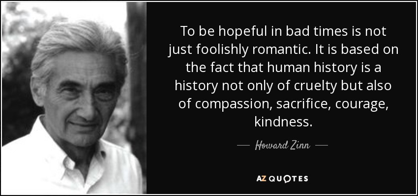 “To be hopeful in bad times is not just foolishly romantic. It is based on the fact that human history is a history not only of cruelty, but also of compassion, sacrifice, courage, kindness.