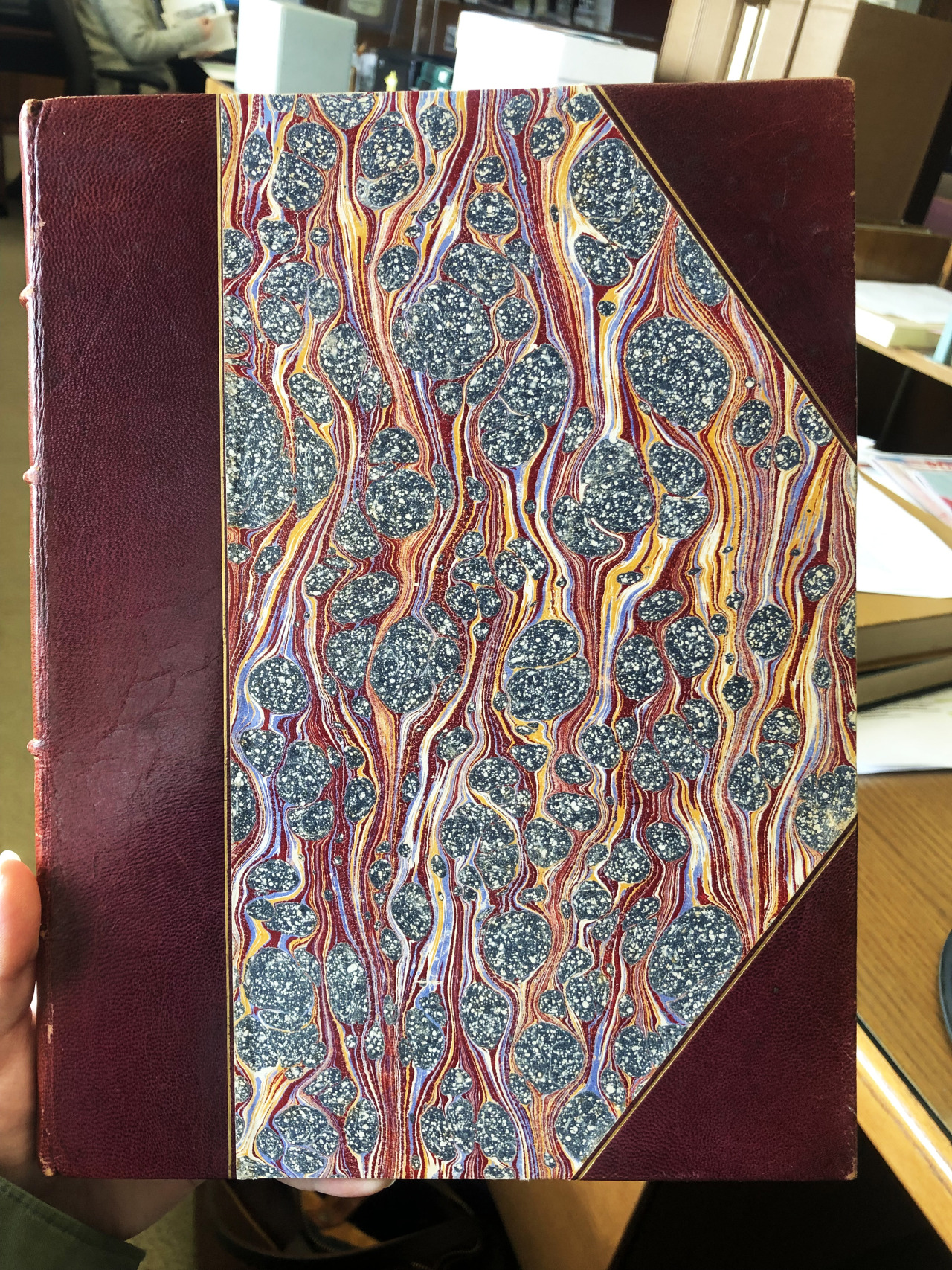 This psychdelic marbled binding is on Le Terrecotte Figurate del Museo Nazionale di Napoli, or, “The Figured Terracottas of the National Museum of Naples.” The book is by archaeologist and historian Alda Levi (1890-1950) and was published by Vallecchi Firenze Publishing House in 1926. Levi’s work included excavations on the Via dell’Abbondanza, the longest road in Pompeii. She was an influential figure in Italian archaeology during the first half of the 20th century despite being a woman and being Jewish. Levi was persecuted by the Fascist government and survived the Holocaust by hiding in Rome.