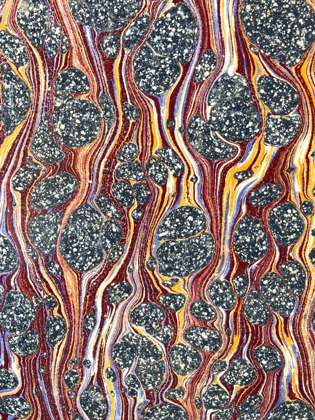 This marbling appears to be a pattern called Gloster (also known as Gloucester, Partidge’s Eye, Oeil de Perdrix, and Stein Marmor mit Grießtropfen). This pattern is created by starting with a Turkish base, then a comb with one set of teeth is drawn across the bath twice vertically (or horizontally), once in either direction with the second pass halving the first. Then one or more colors of ink mixed with a dispersant are sprinkled onto the bath, causing those last spots to have open, very fine spots inside them.