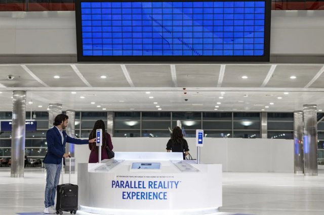 Parallel Reality uses a kiosk, billboard and facial recognition, or a scan of a printed or digital boarding pass to display an individual’s personal flight information. What’s kind of mindblowing is that the person standing beside you will only sees their own—yours is not visible to them. In fact, no one else can see your information. The special screens can show up to 100 passengers’ personalized information at a time.