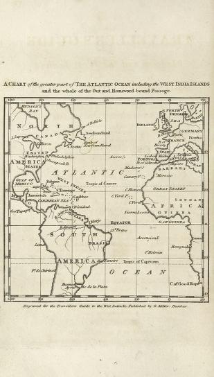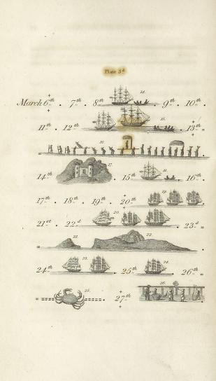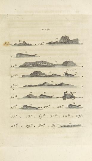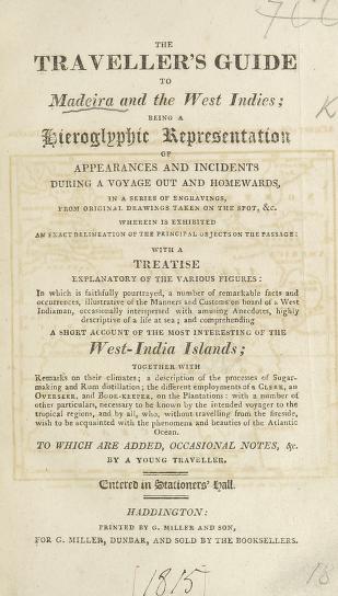 The volume is titled The Traveller’s Guide to Madeira and the West Indies. Being a hieroglyphic representation of appearances and incidents during a voyage out and homewards. … With a treatise explanatory of the various figures, etc; 1815; Haddington, G. Miller and sons. The clever book employs a series of “hieroglyphic” plates to frame an account of a trade voyage. The illustrated pages display a calendar-like grid, for each day either a dot, to connote nothing of importance happened, or a little illustration summing up that day’s events. For a further explanation of these “emblematic figures” the author offers an “Explanatory Key”, which reads ostensibly as a regular journal recounting highlights from the course of days, except rather than under the headings of dates, they relate directly to the pictures and are so numbered. According to its anonymous author, referred to only as “a young traveller”, the plates came first, the motive for which was a “deficiency of time to note down my observances as they occurred”.