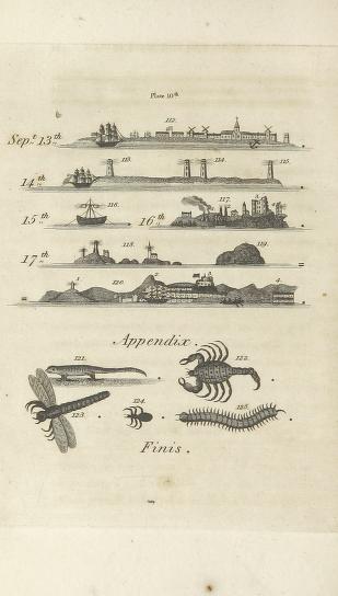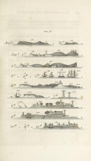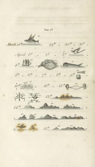 The volume is titled The Traveller’s Guide to Madeira and the West Indies. Being a hieroglyphic representation of appearances and incidents during a voyage out and homewards. … With a treatise explanatory of the various figures, etc; 1815; Haddington, G. Miller and sons. The clever book employs a series of “hieroglyphic” plates to frame an account of a trade voyage. The illustrated pages display a calendar-like grid, for each day either a dot, to connote nothing of importance happened, or a little illustration summing up that day’s events. For a further explanation of these “emblematic figures” the author offers an “Explanatory Key”, which reads ostensibly as a regular journal recounting highlights from the course of days, except rather than under the headings of dates, they relate directly to the pictures and are so numbered. According to its anonymous author, referred to only as “a young traveller”, the plates came first, the motive for which was a “deficiency of time to note down my observances as they occurred”.