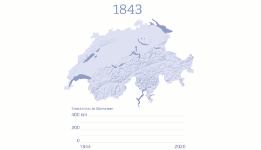 SRF’s history of the Swiss railway includes a map (above) which shows the opening of new railway lines by year of construction. This map is accompanied by a graph which shows the length (in km) of railway lines opened in each year. From the animation of this map you can see that the golden era of the Swiss railway was in its first one hundred years. Since the 1920s further extensions to the railway in Switzerland have been fairly sporadic.