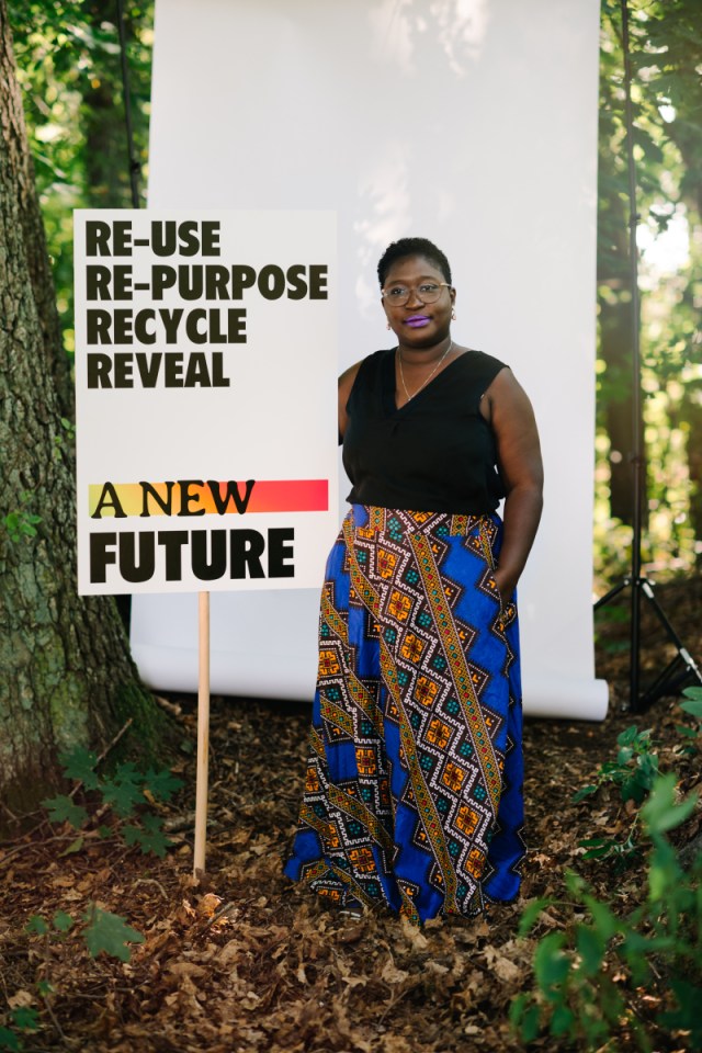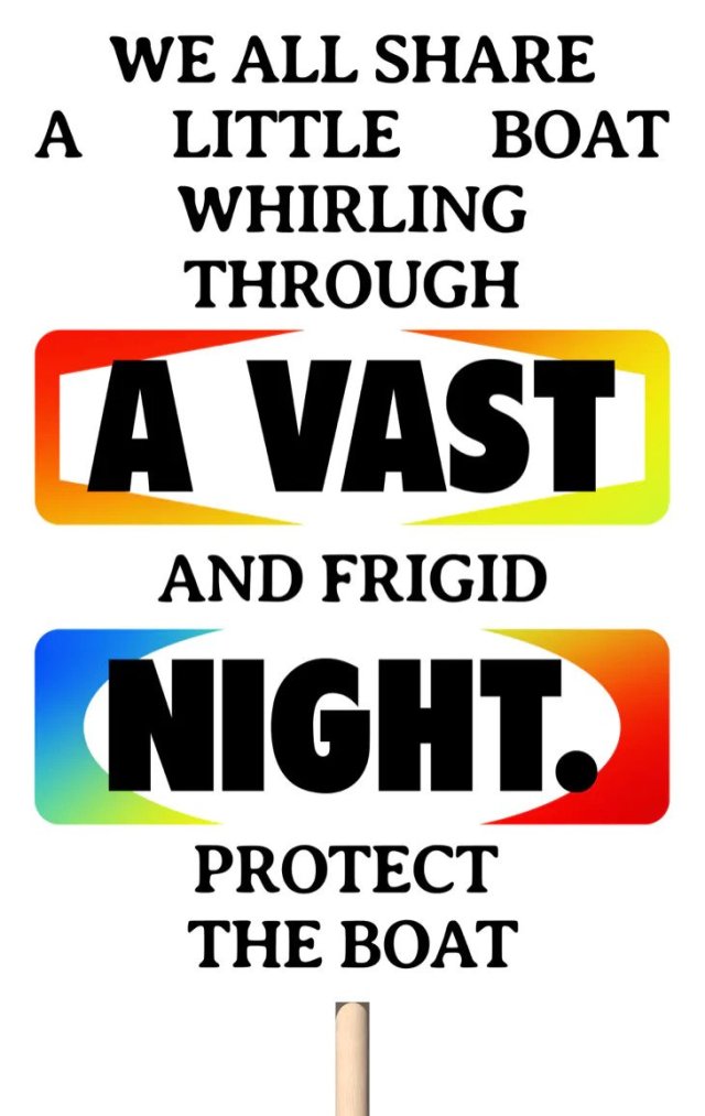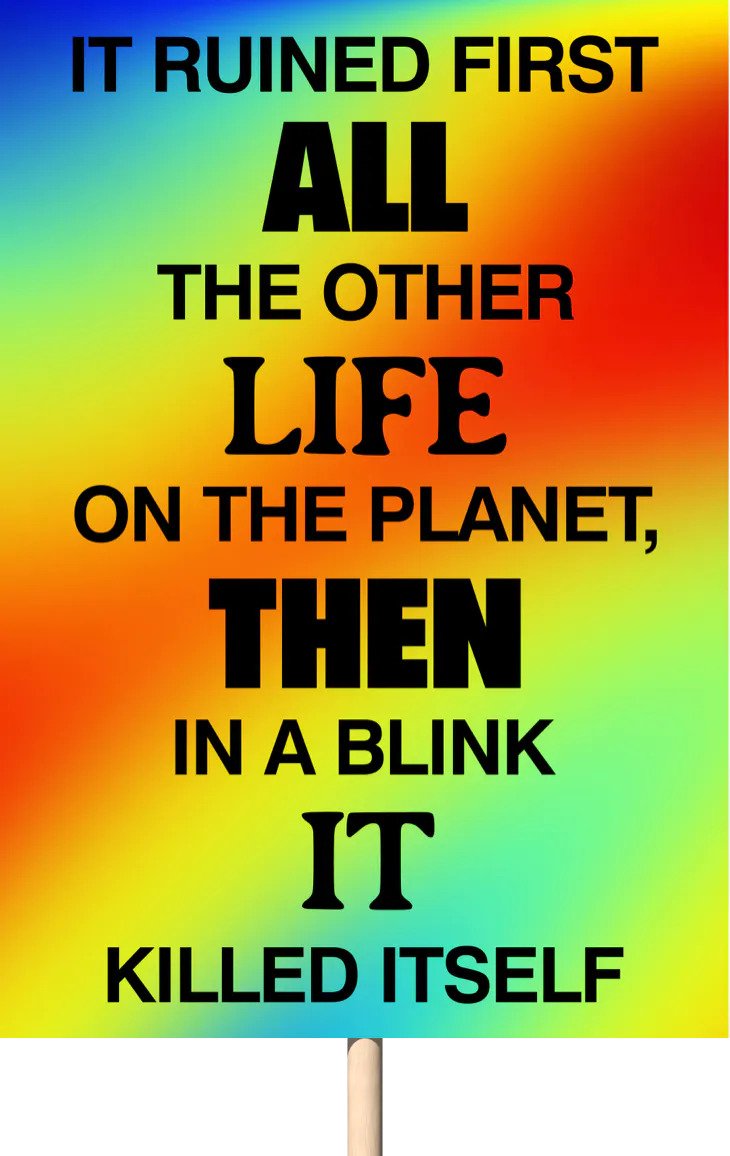 Printed on the posters are one-liners such as “It ruined first all the other life on the planet, then in a blink it killed itself,” by Lauren Groff, and “It is through hope that we create the world not yet visible but possible,” by Vanessa Nakate.