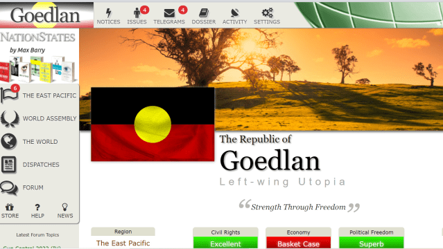 - The community. I can’t even explain this because I don’t fully understand it. I made a site where you could create a nation and talk to people. The community did everything else, i.e. turned that into something interesting, with political intrigue, relationships, lore, rules; basically the vast majority of what makes NationStates worth your time. This includes regional leaders, ordinary nations, World Assembly Delegates, admin, Roleplay Mentors, Founders, dispatch authors, World Census trophy chasers, forum regulars, forum irregulars, anyone who’s taken the time to explain something to someone new to the site, card traders, everyone.