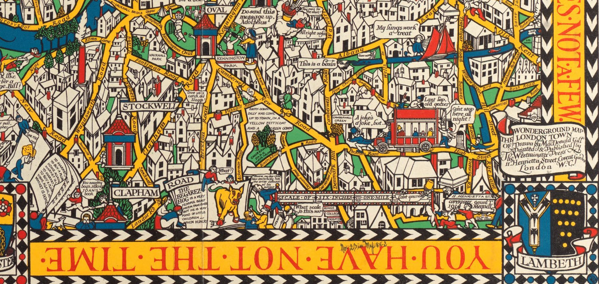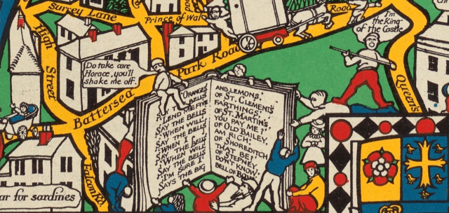 At the very top of this map, you can  find several stanzas from the famous poem The Tyger by William Blake. This map also contains several excerpts from children’s books and  nursery rhymes, as well as a plethora of puns about different places in London, like a reference to hurling hams in Hurlingham.