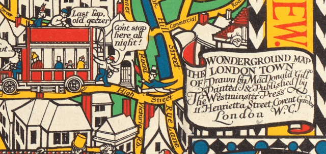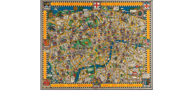 This pictorial map of London was originally published in 1914 as an advertising poster for the London Underground. The design became very popular with the public and was published in several different editions. It is credited with reviving Tube travel as well as inspiring “Wonderland” maps in other cities, and influencing pictorial mapmaking in the twentieth century.
