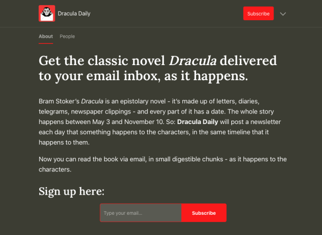 Regular readers of Travel Between The Pages may recall a post from this day last year about a very clever project that delivers daily episodes from Bram Stoker’s iconic vampire novel Dracula. If you missed Dracula Daily, or if you just can’t get enough of the classy ghoul, why not subscribe by clicking this link.