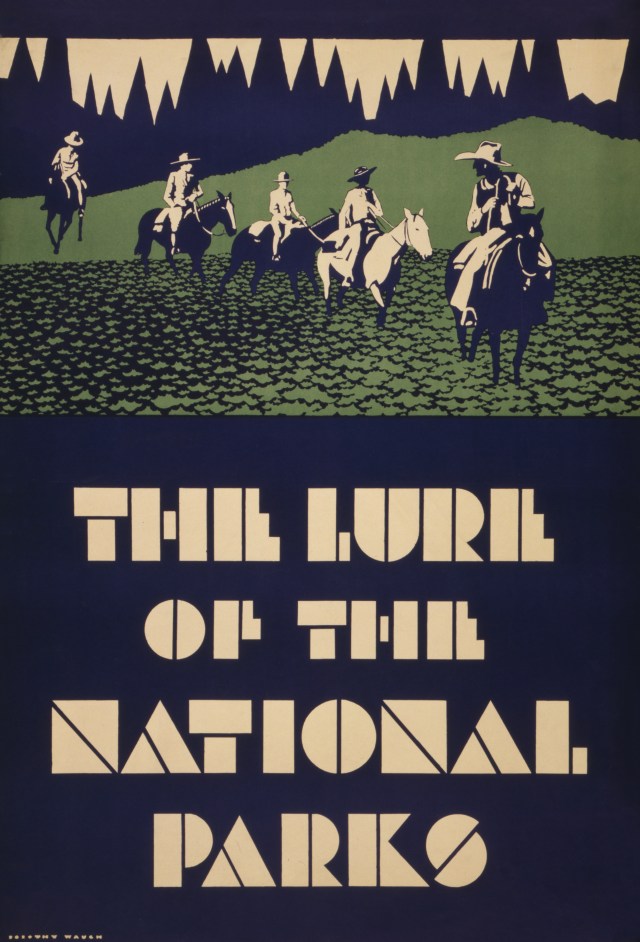 I’ve long been a fan of vintage travel posters and I especially enjoy the historic posters created to promote the U.S. National Parks. In 1934, the park service began to encourage state and national park tourism by designing their own promotional posters to be displayed at local railroad and bus stations and hotels. In one of its 1934 Park Bulletin newsletters, the organization explained: “With the aid of State Park Emergency Conservation Work Funds, it has been possible for the Service to have printed for distribution to tour bureaus, railroads, schools, travel clubs, etc., a set of six colorful posters depicting national park scenes. Miss Dorothy Waugh, a New York artist, sketched the posters and they were printed by the Burland Printing Company of New York City under contract let by the Government Printing Office. United States citizens for many years have seen the Swiss Alps, the Italian Lake country, and other beauty spots of foreign lands depicted in beautiful posters on display throughout the land and it is time that Americans should be acquainted with their own beauty spots through the same medium.”