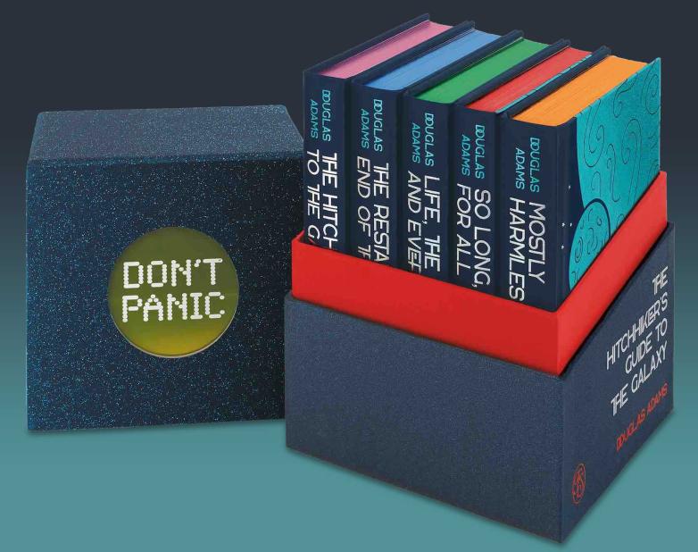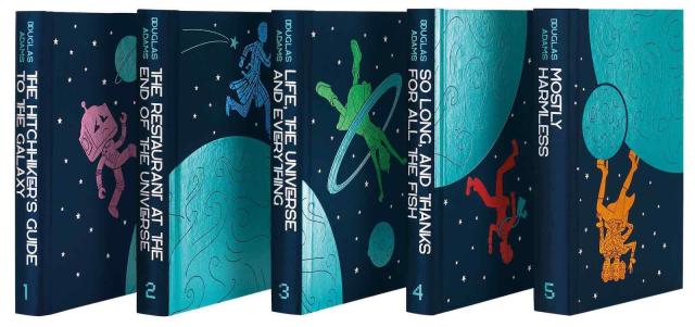 There isn’t a better time to release a collectible edition of Douglas Adams’ Hitchhiker’s Guide to the Galaxy than on Towel Day May 25th. The Folio Society is releasing a special edition of Adams’ trilogy in five parts, featuring “70 illustrations by Jonathan Burton, 35 unique to these new volumes, and an exclusive preface by inspirational physicist Carol Rovelli.”There are just 750 of these sets being created; they’ll be hand-numbered and signed by the illustrator “on a limitation tip shining with holographic silver.” The binding designs, also created by Burton, are similarly lavish, “blocked in an eye-catching rainbow of foils and, arranged next to each other, they create a pleasing single image. The five volumes are presented in a display box fit for the President of the Galaxy himself, part-bound in glittering blue cloth with an explosion of silver stars on the interior. A transparent window—with DON’T PANIC inscribed in large friendly letters—allows a peek at the foil-blocked spines. Signed by the artist, this splendid edition is completed with a unique print of the Guide itself.”