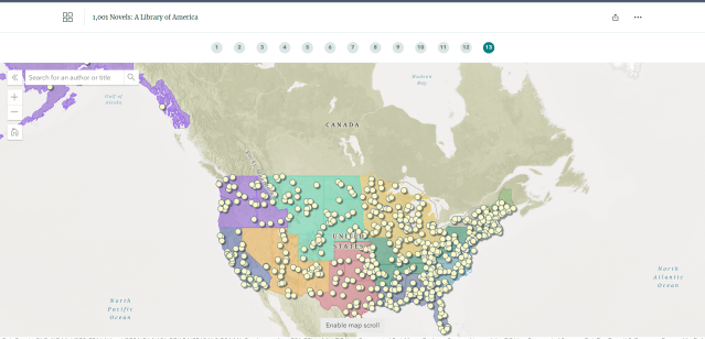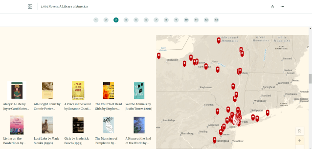 1,001 Novels: A Library of America is a brilliant interactive literary map of the United States. The project maps more than 1,000 works of fiction and sets them based on the geographical “heart” of each story.