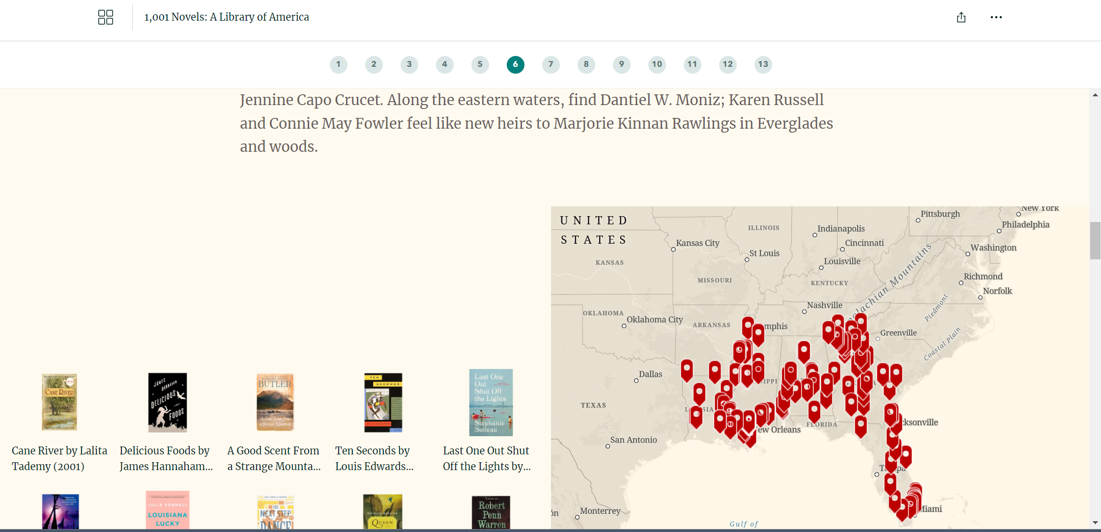 1,001 Novels: A Library of America is a brilliant interactive literary map of the United States. The project maps more than 1,000 works of fiction and sets them based on the geographical “heart” of each story.