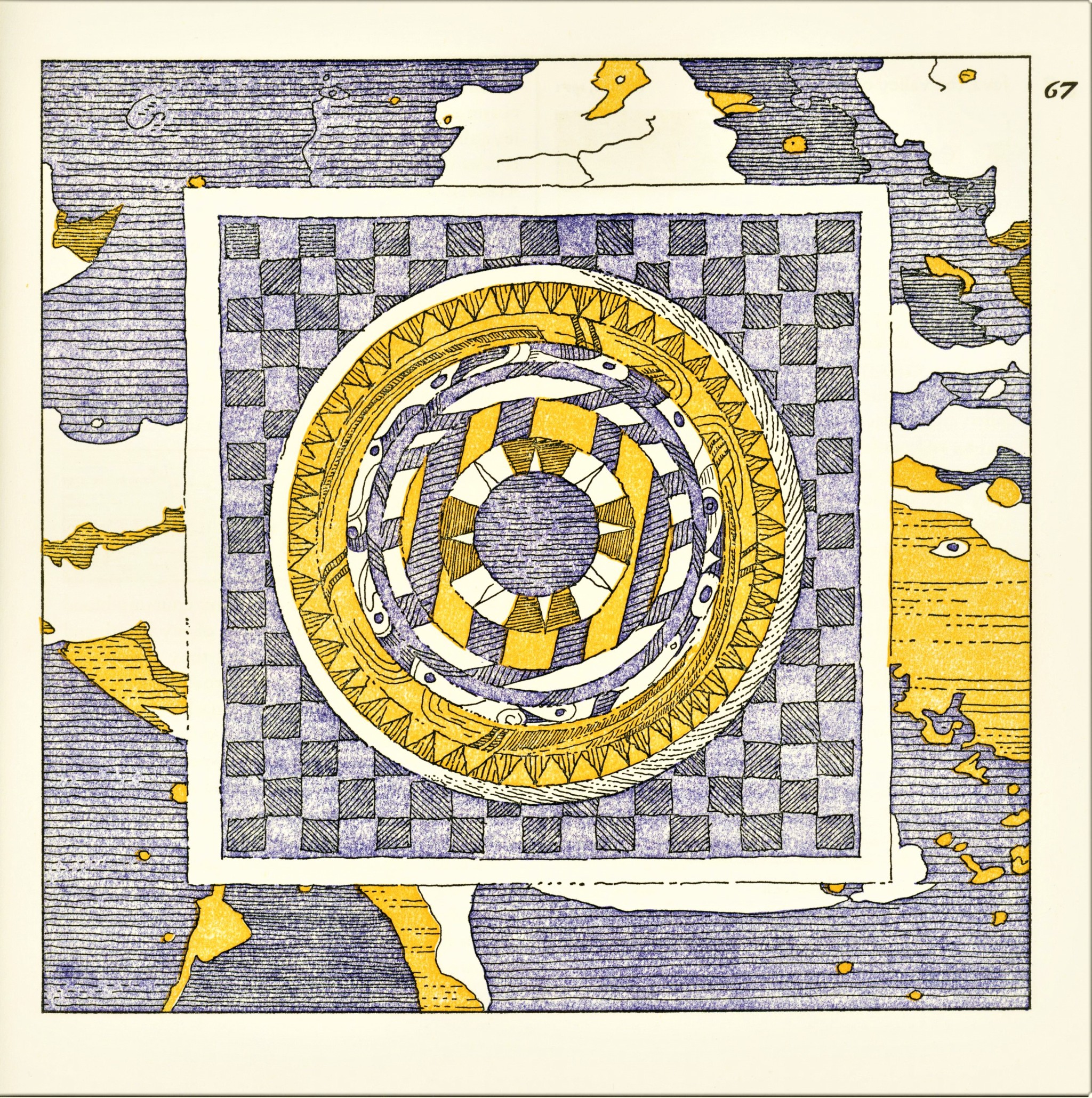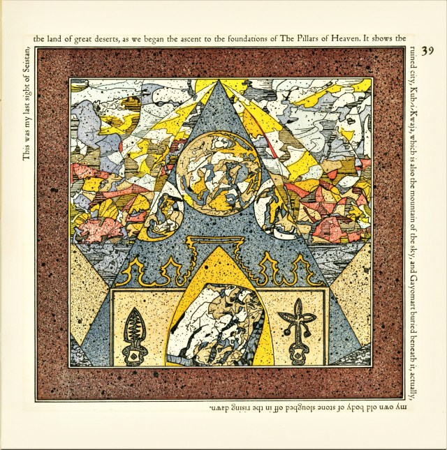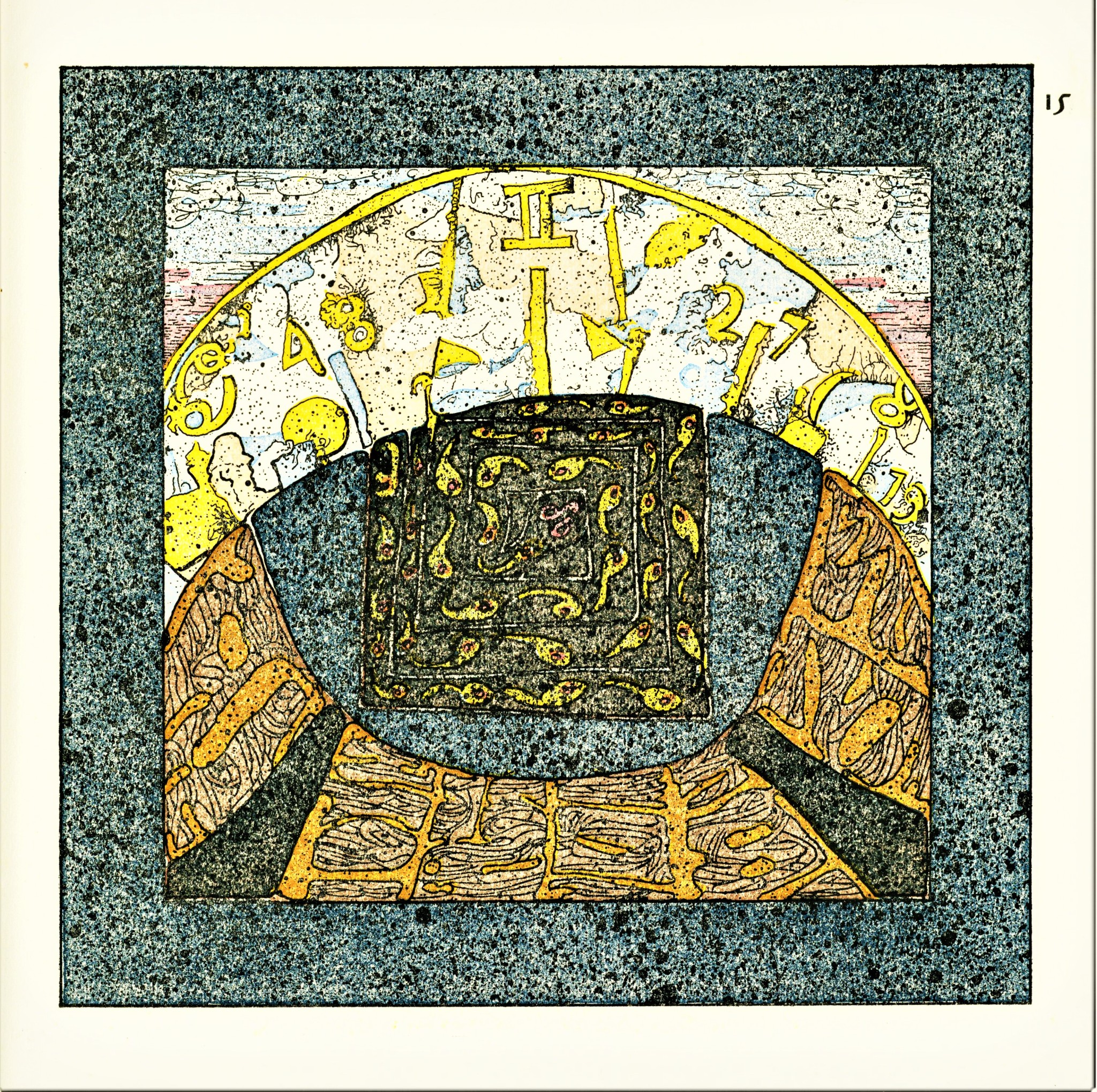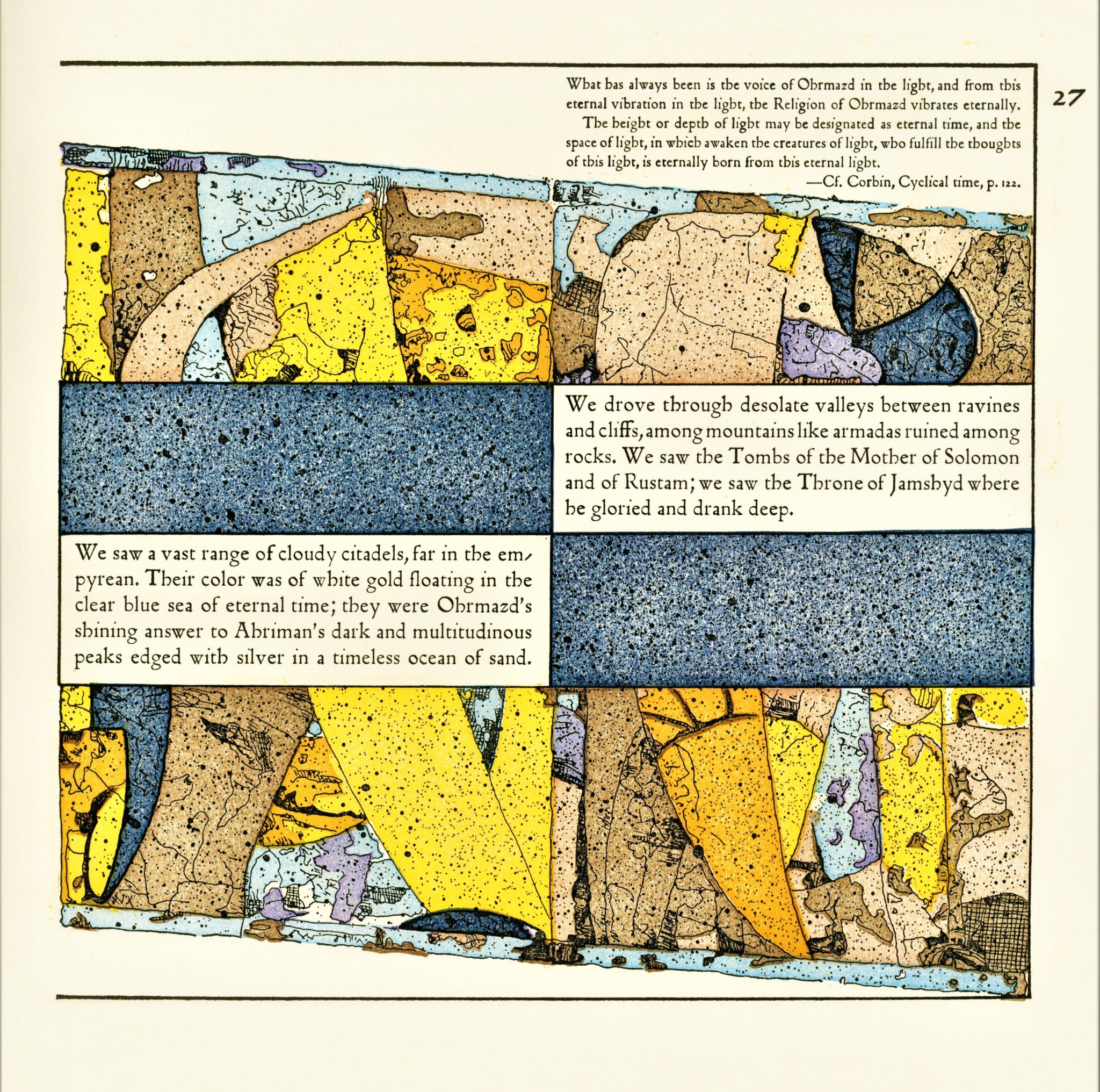 Martin wrote in the exhibition catalog Four Decades that he “thought it would be great to take the 1971 text, revise it into an almost mythological story and to develop illustrations to fit.” For the project, he studied medieval and Islamic illuminated manuscripts and drew inspiration from “everything from Jung to Avicenna, from my mystical geometry to Byzantine art to Islamic calligraphy.”