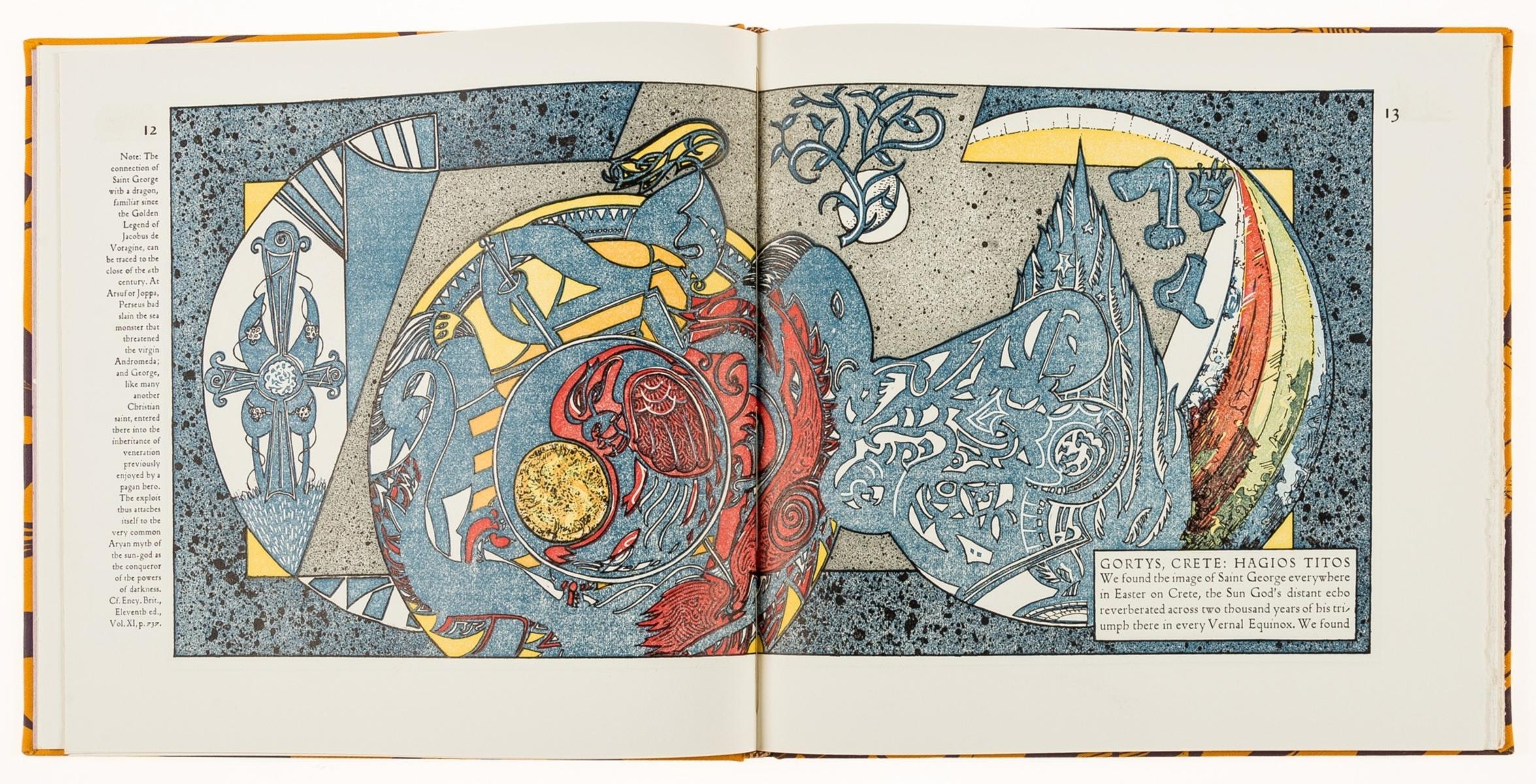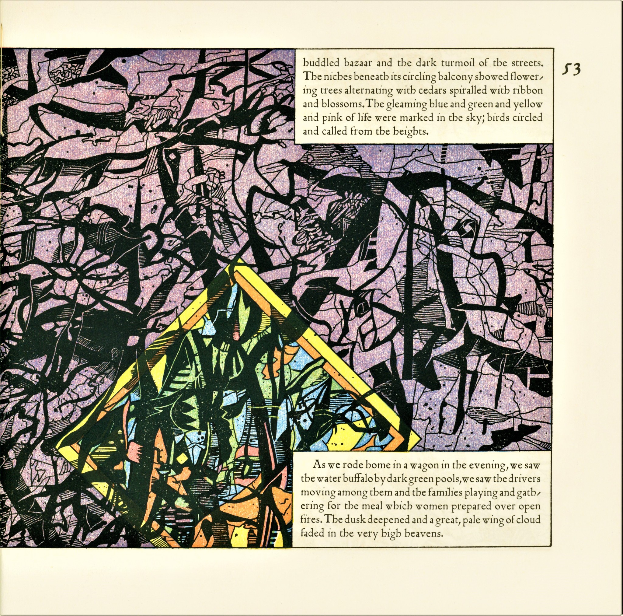 Nevertheless, I still find A Travel Book to have an intriguing backstory. The author and illustrator Fred Martin, who was retiring after a long career at the San Francisco Art Institute, rewrote the notes he had made during a 1971 round-the-world trip and created 42 color linocuts based on his watercolor designs for this publication that was printed in handset Inkunabula type, designed by Raffaello Bertieri in 1921 for the Nebiolo type foundry, on specially-made cotton paper by the Curtis Paper Company. The binding is by Susan Spring Wilson with a silkscreened-printed cloth design by Martin.