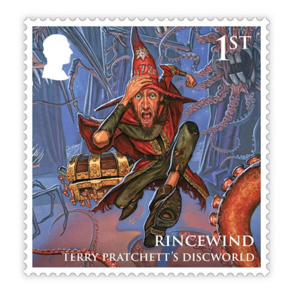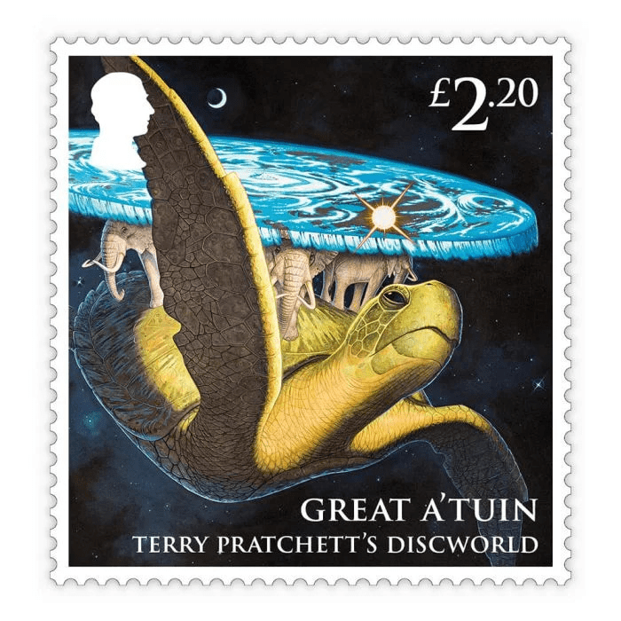 Last week, a new Royal Mail stamp collection that celebrates Terry Pratchett’s fantasy Discworld series, and the 40th anniverary of its first book, The Colour of Magic was released. The eight special stamps feature some of Discworld’s favorite characters including Rincewind, The Librarian, Granny Weatherwax, Sam Vimes, and Great A’Tuin, as well as specially commissioned artworks of Death and Mort, Tiffany Aching and Moist von Lipwig – all created by Terry Pratchet’s illustrator of choice, Paul Kidby.