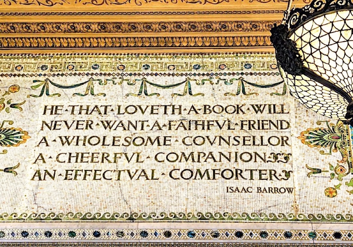 The mosaics are located in the staircase that leads from the Preston Bradley Hall – the site of the world’s largest Tiffany stained-glass dome. This historic hall was originally the place where people picked up the books they had requested from the Chicago Public Library.