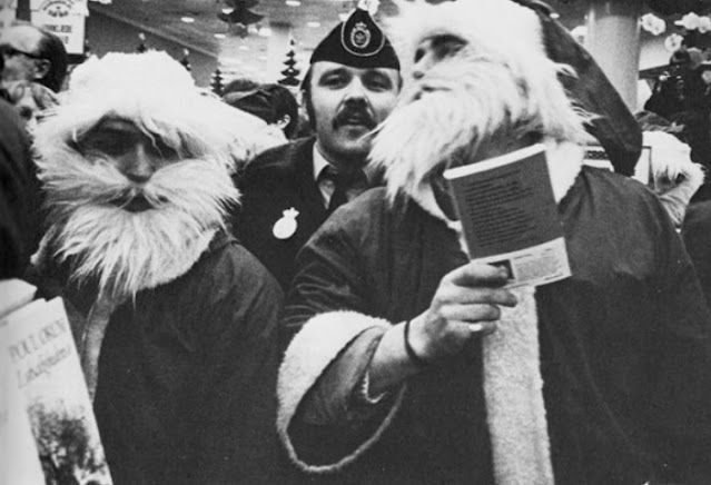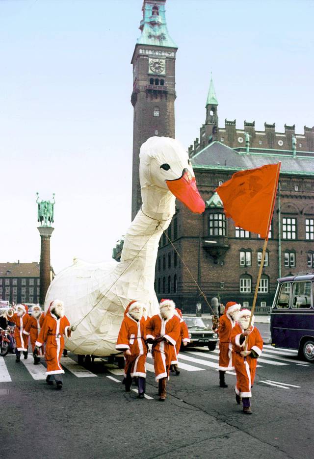 On this date in1974, an army of more than 100 men, women, and children, all dressed as Santa Claus, invaded central Copenhagen. They paraded through the city in a procession that included a gigantic “Trojan” goose, angels, Danish flags, and livestock. At first they visited hospitals, sang carols, played with children in schools, roller-skated, and gave away holiday candies and hot chocolate, creating a celebratory atmosphere. They also invaded the General Motors plant demanding that workers be made the owners. One Santa Claus caused confusion by attempting to get a loan from a bank. Other disruptors visited the stock exchange.