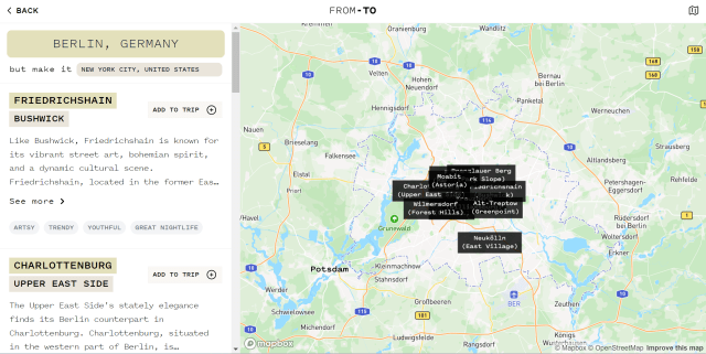 The new website From-To promises to ‘make new places familiar’. It does this by comparing districts in the city you wish to travel to with a city you know well. For example if you are traveling to New York from Berlin then From-To informs you that Friedrichshain is like the Bushwick, Brooklyn, Charlottenburg is like the Upper East Side.