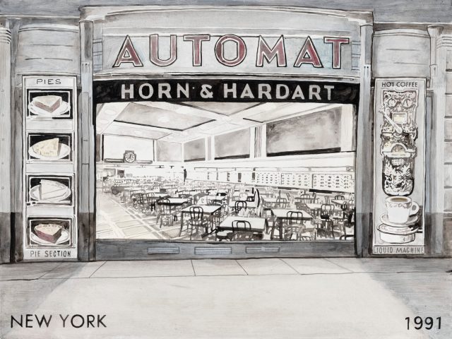 The painting range from the prosaic sites such as New York City’s beloved Automat to sacred sites such as ruined Cluny Abbey.
