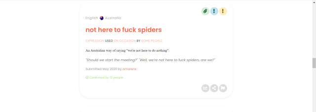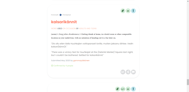 Originally funded by crowdsourcing, the clever project is run by a young graduate student in linguistics who is creating a database of linguistic tropes and idiomatic speech from across the world. I have just learned that there is a word in Finnish for staying in and getting drunk in your underwear rather than going out and socializing. And when you are in Spain and something amazes you just say “Hala Me flipo.” for “I’m flipping out.”