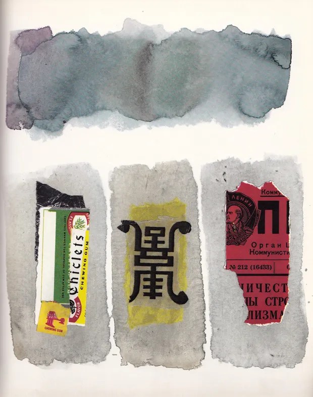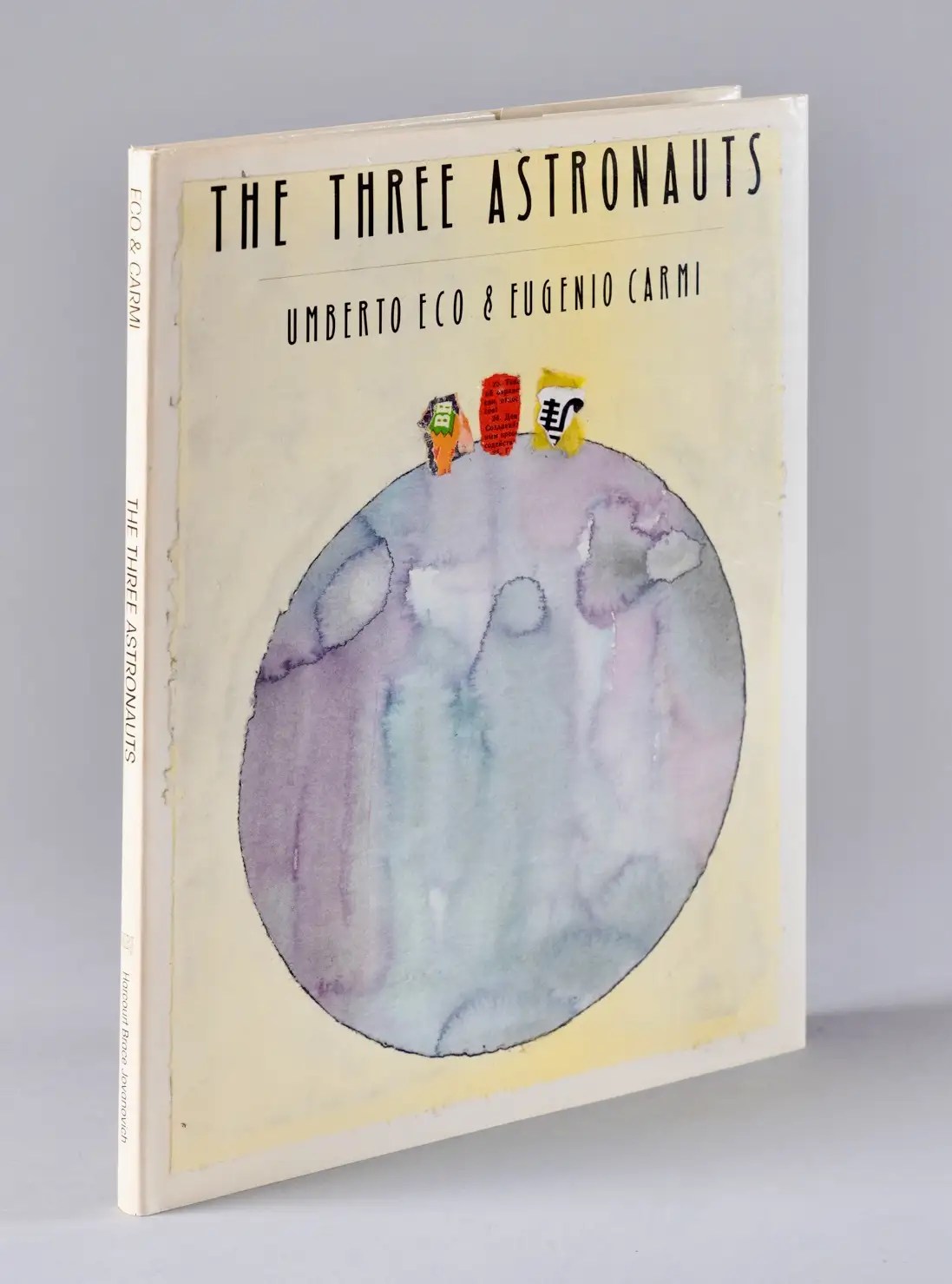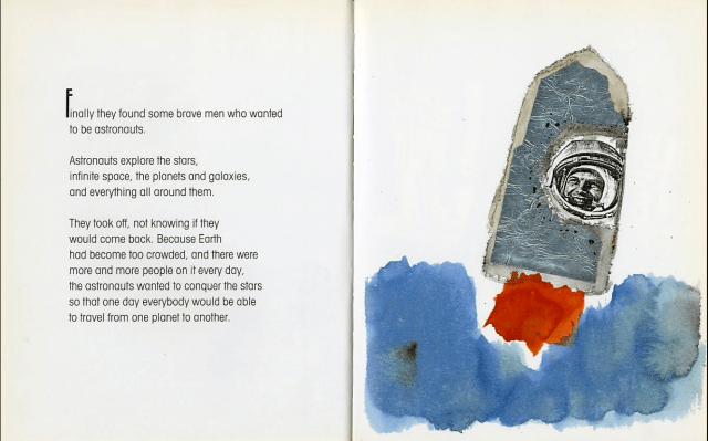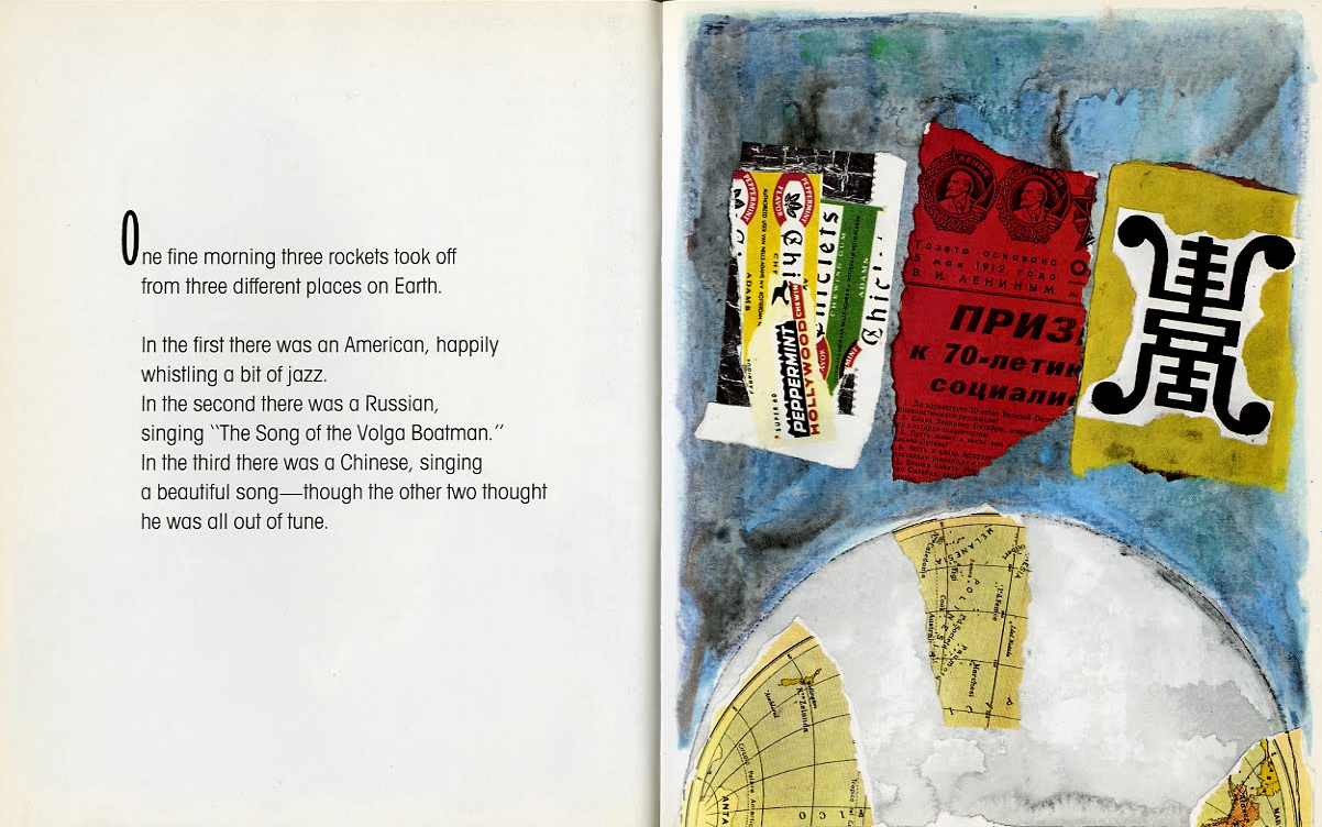 The book’s illustrations are by award-winning artist Eugenio Carmi, and consist of colorful collages and watercolors. Surreal and symbolic, the artwork excellently exemplifies Eco’s story of understanding and compassion. The astronauts are depicted by swatches of colored paper rather than as people; the American as a multicolored box of Chiclets, the Russian a red clipping from Pravda, and the Chinese as a yellow ideogram.